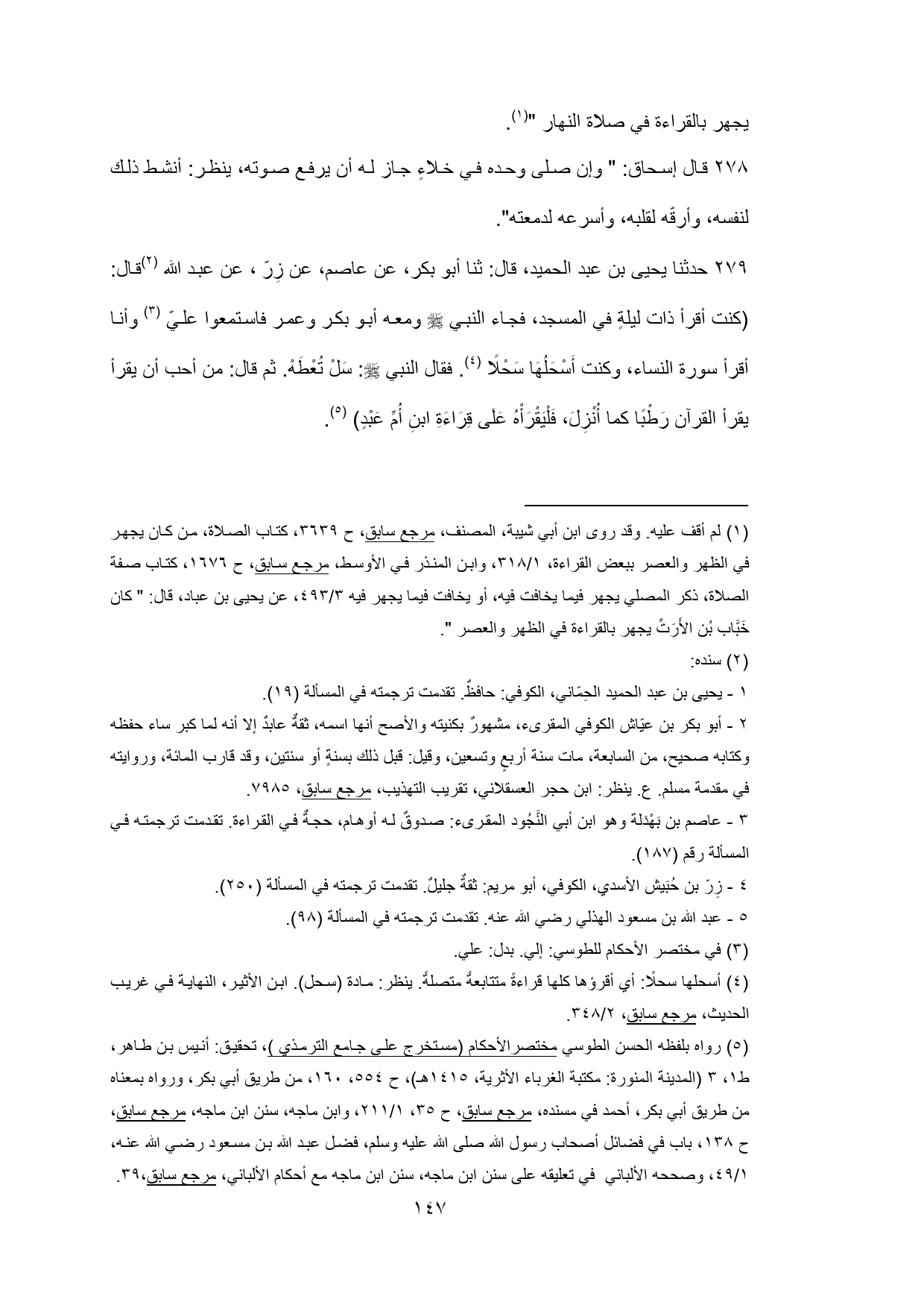 279 - حدثنا يحيى بن عبد الحميد، قال: ثنا أبو بكر، عن عاصم، عن زِرّ، عن عبد الله (¬3) قال: (كنت أقرأ ذات ليلةٍ في المسجد، فجاء النبي - صلى الله عليه وسلم - ومعه أبو بكر وعمر فاستمعوا عليّ (¬4) وأنا أقرأ سورة النساء، وكنت أَسْحَلُهَا سَحْلًا (¬5). فقال النبي - صلى الله عليه وسلم -: سَلْ تُعْطَهْ. ثم قال: من أحب أن يقرأ القرآن رَطْبًا كما أُنْزِلَ، فَلْيَقْرَاهُ عَلَى قِرَاءَةِ ابنِ أُمِّ عَبْدٍ) (¬6).