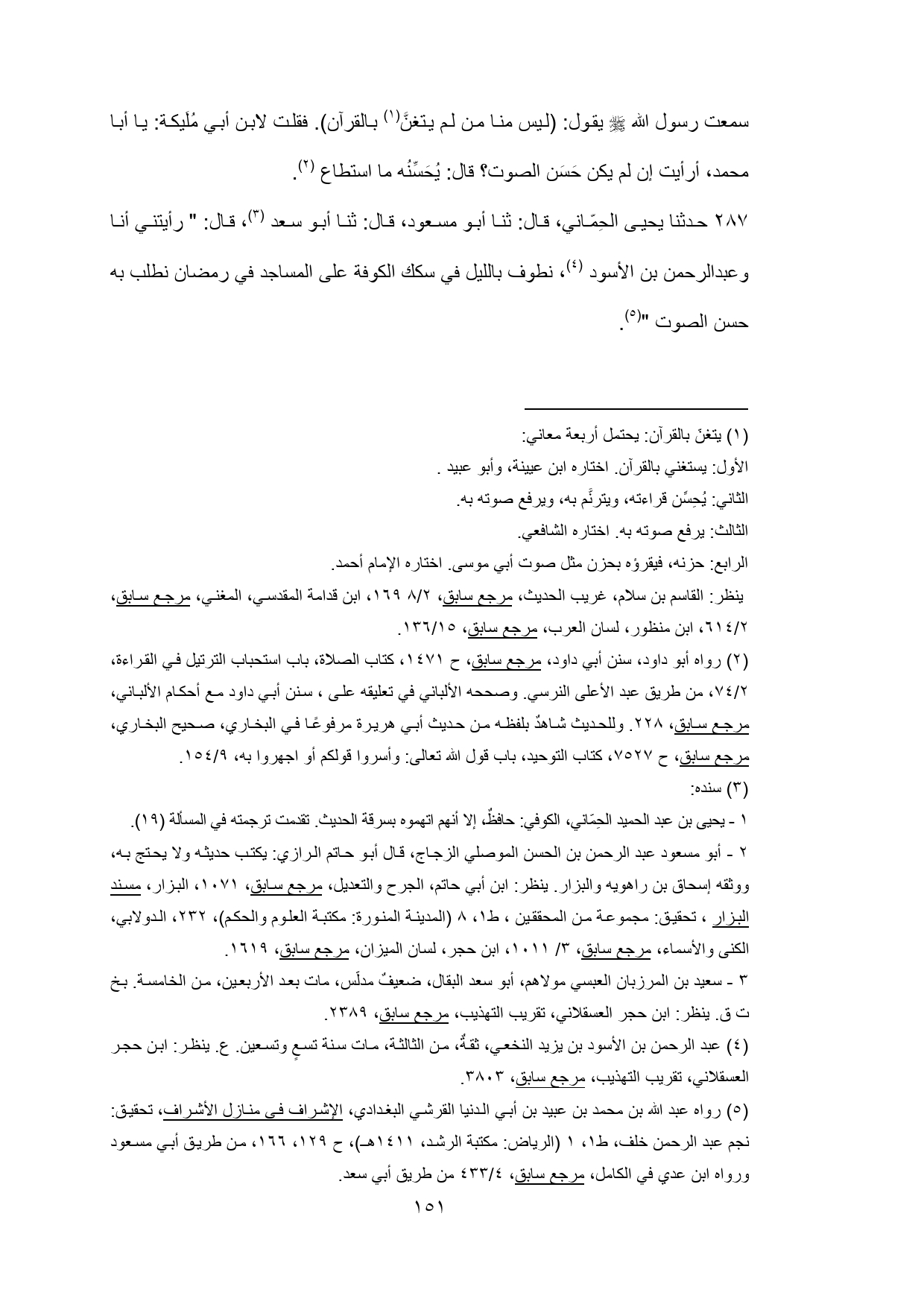 287 - حدثنا يحيى الحِمّاني، قال: ثنا أبو مسعود، قال: ثنا أبو سعد (¬3) , قال: " رأيتني أنا وعبدالرحمن بن الأسود (¬4) , نطوف بالليل في سكك الكوفة على المساجد في رمضان نطلب به حسن الصوت " (¬5).