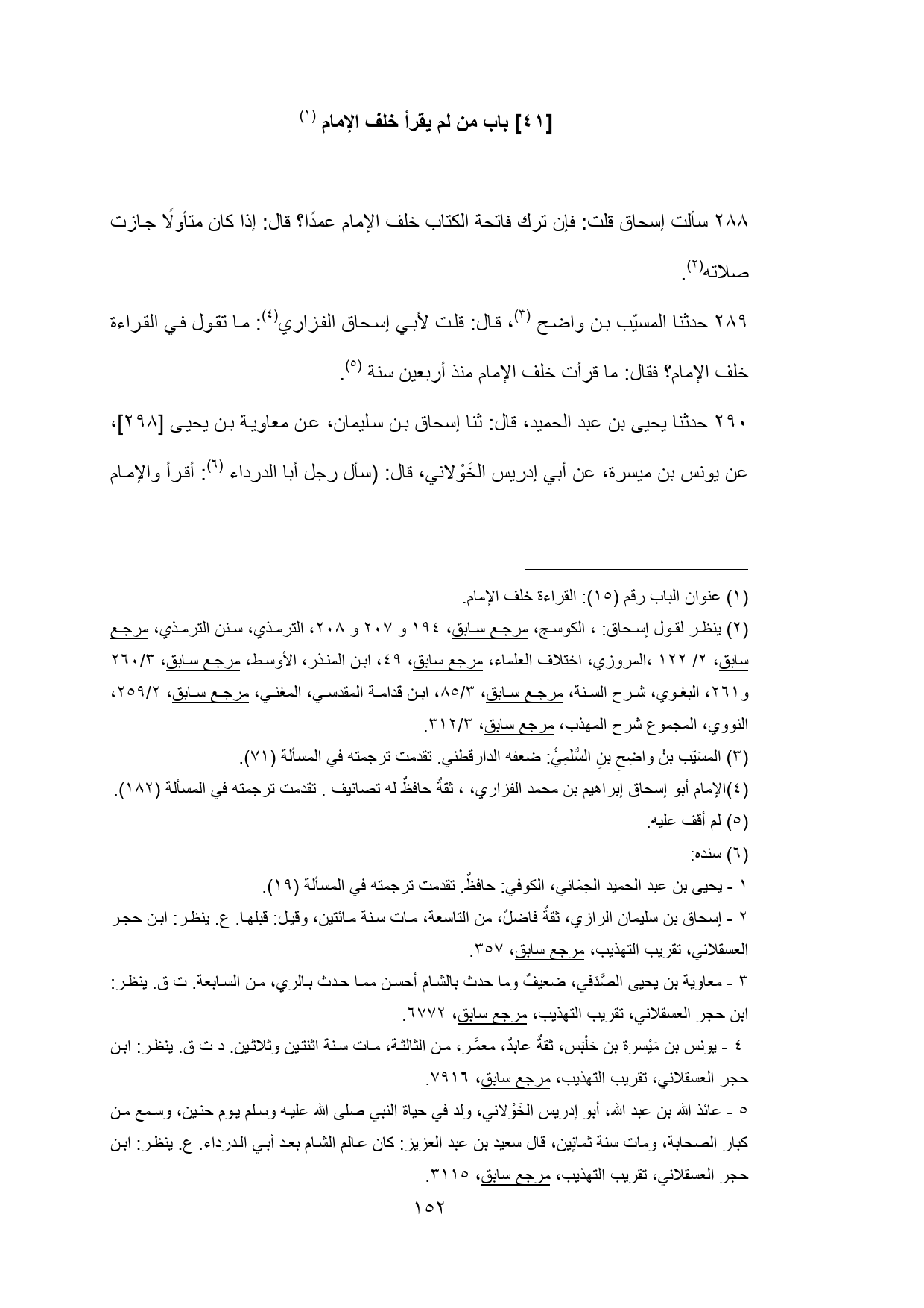 289 - حدثنا المسيّب بن واضح (¬3) , قال: قلت لأبي إسحاق الفزاري (¬4): ما تقول في القراءة خلف الإمام؟ فقال: ما قرأت خلف الإمام منذ أربعين سنة (¬5).