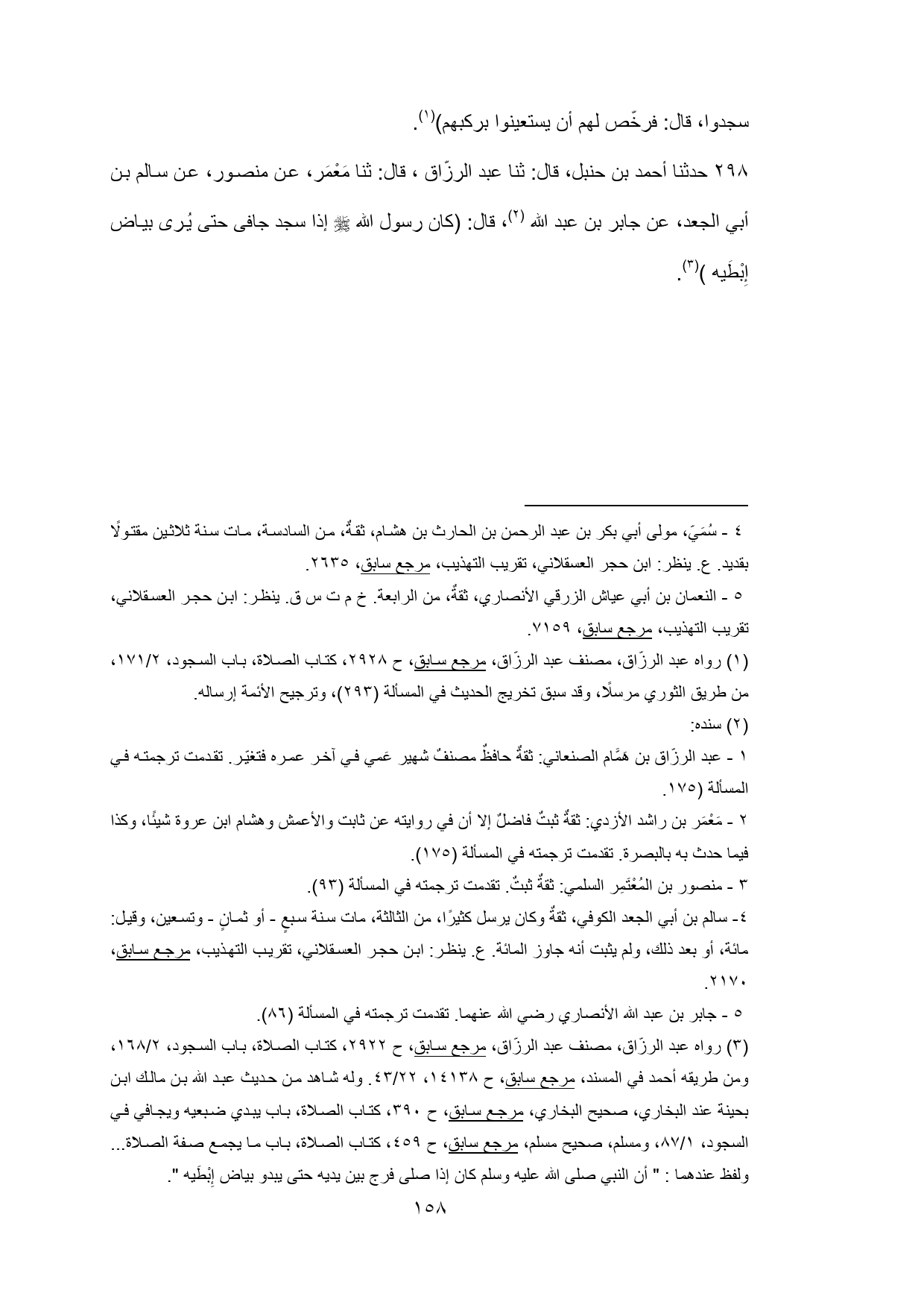 298 - حدثنا أحمد بن حنبل، قال: ثنا عبد الرزّاق، قال: ثنا مَعْمَر، عن منصور، عن سالم بن أبي الجعد، عن جابر بن عبد الله (¬2) , قال: (كان رسول الله - صلى الله عليه وسلم - إذا سجد جافى حتى يُرى بياض إِبْطَيه) (¬3).