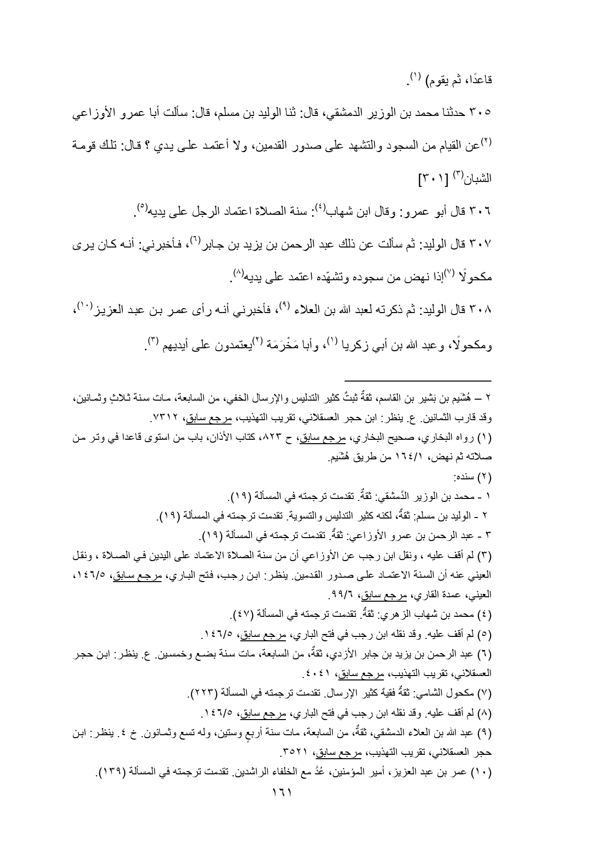 305 - حدثنا محمد بن الوزير الدمشقي، قال: ثنا الوليد بن مسلم، قال: سألت أبا عمرو الأوزاعي (¬2) عن القيام من السجود والتشهد على صدور القدمين، ولا أعتمد على يدي؟ قال: تلك قومة الشبان (¬3) [301]