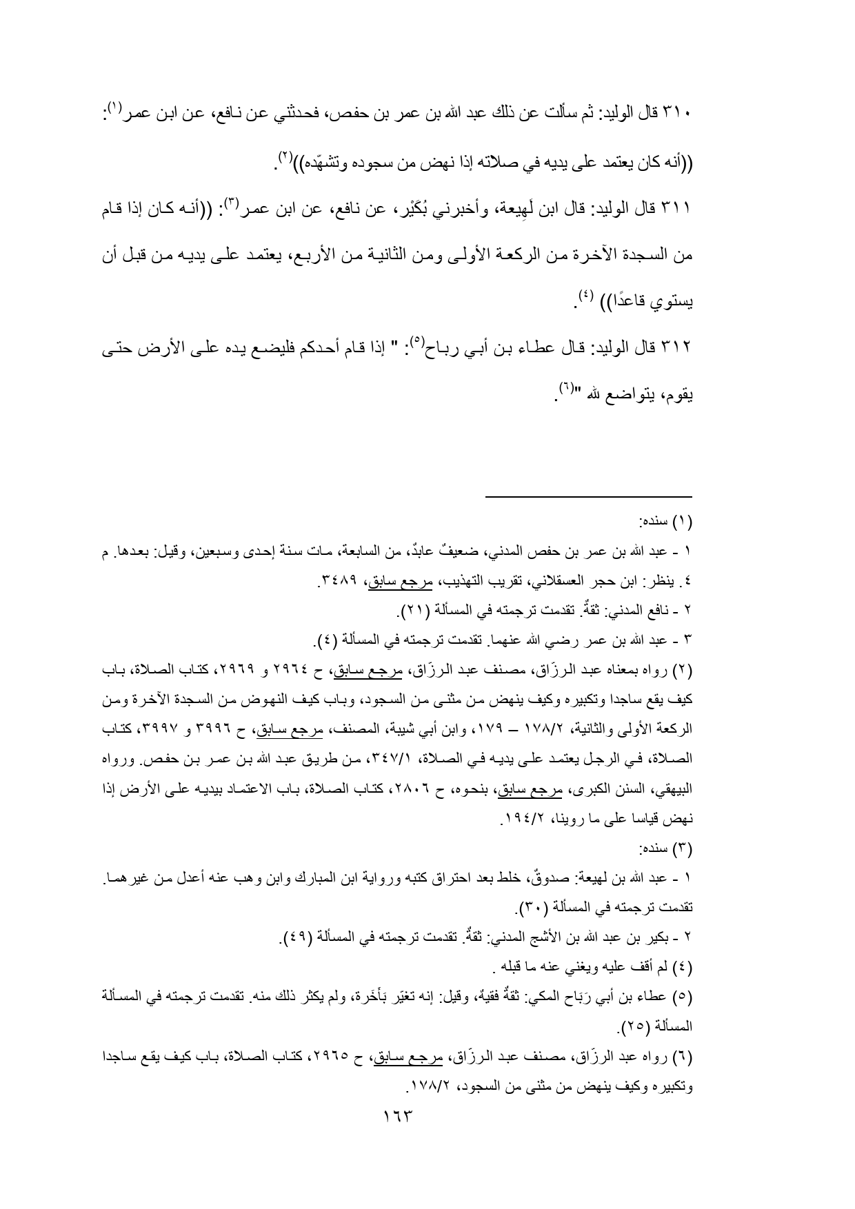 (¬2) رواه بمعناه عبد الرزّاق، مصنف عبد الرزّاق، مرجع سابق، ح 2964 و 2969، كتاب الصلاة، باب كيف يقع ساجدا وتكبيره وكيف ينهض من مثنى من السجود، وباب كيف النهوض من السجدة الآخرة ومن الركعة الأولى والثانية، 2/ 178 - 179، وابن أبي شيبة، المصنف، مرجع سابق، ح 3996 و 3997، كتاب الصلاة، في الرجل يعتمد على يديه في الصلاة، 1/ 347، من طريق عبد الله بن عمر بن حفص. ورواه البيهقي، السنن الكبرى، مرجع سابق، بنحوه، ح 2806، كتاب الصلاة، باب الاعتماد بيديه على الأرض إذا نهض قياسا على ما روينا، 2/ 194.