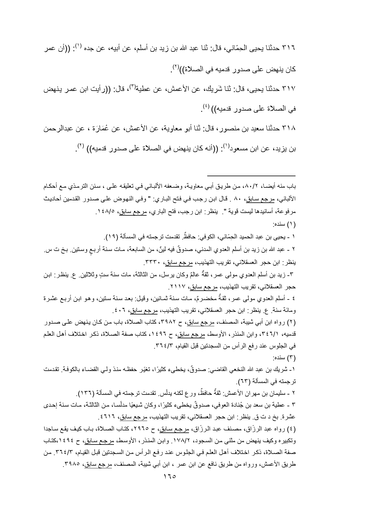 318 - حدثنا سعيد بن منصور, قال: ثنا أبو معاوية، عن الأعمش، عن عُمَارَة، عن عبدالرحمن بن يزيد، عن ابن مسعود (¬5): ((أنه كان ينهض في الصلاة على صدور قدميه)) (¬6).