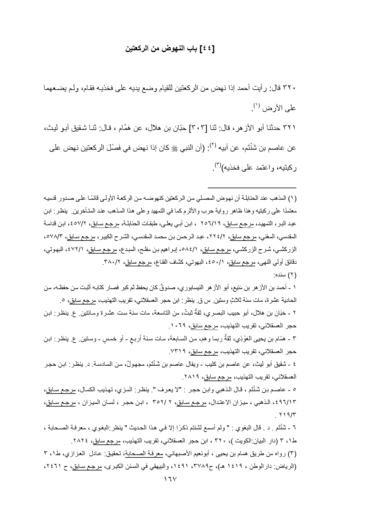 321 - حدثنا أبو الأزهر، قال: ثنا [303] حَبّان بن هلال، عن هَمَّام، قال: ثنا شقيق أبو ليث، عن عاصم بن شَنْتَم، عن أبيه (¬2): (أن النبي - صلى الله عليه وسلم - كان إذا نهض في فَصْلَ الركعتين نهض على
