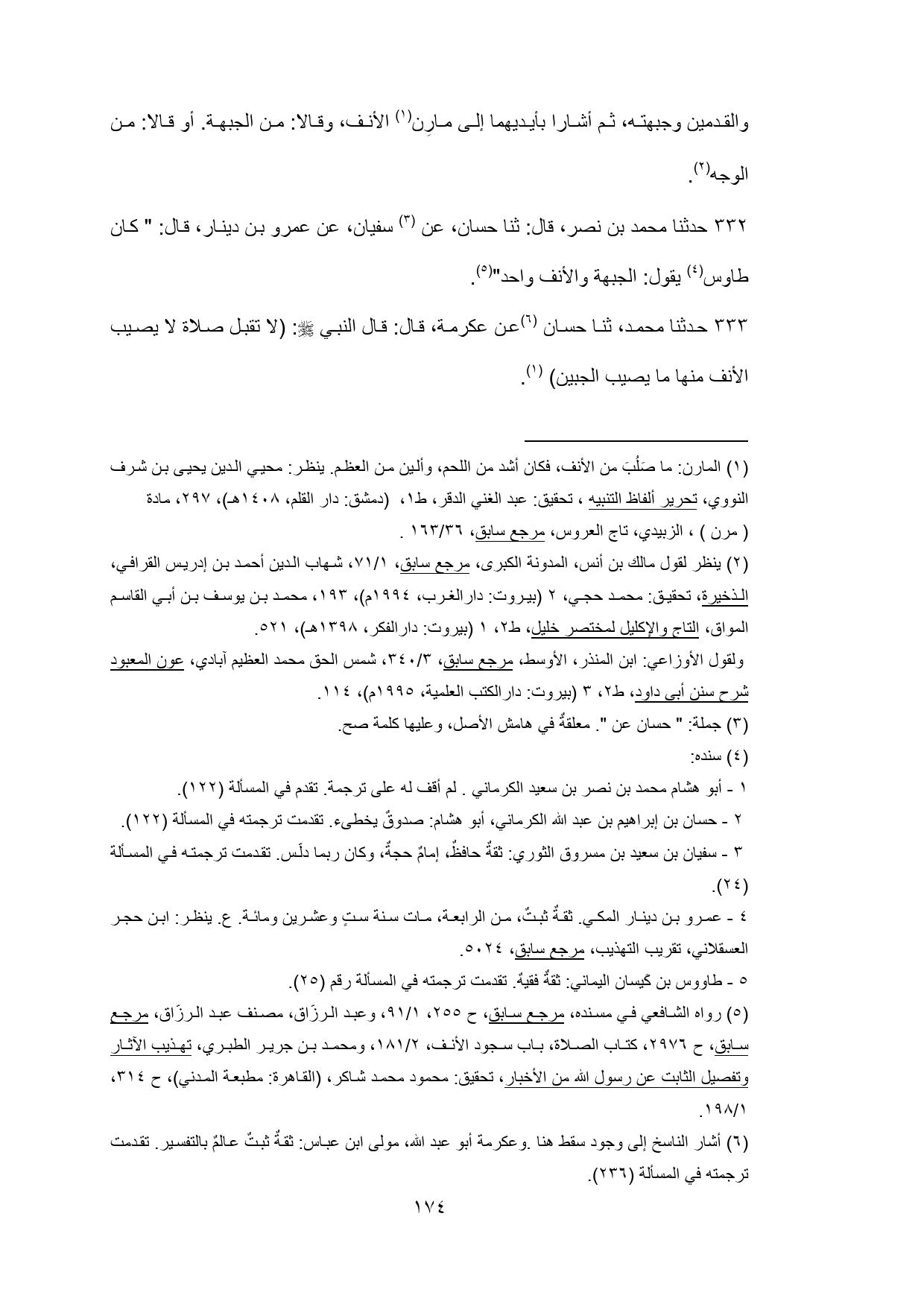332 - حدثنا محمد بن نصر، قال: ثنا حسان، عن (¬3) سفيان، عن عمرو بن دينار, قال: " كان طاوس (¬4) يقول: الجبهة والأنف واحد" (¬5).