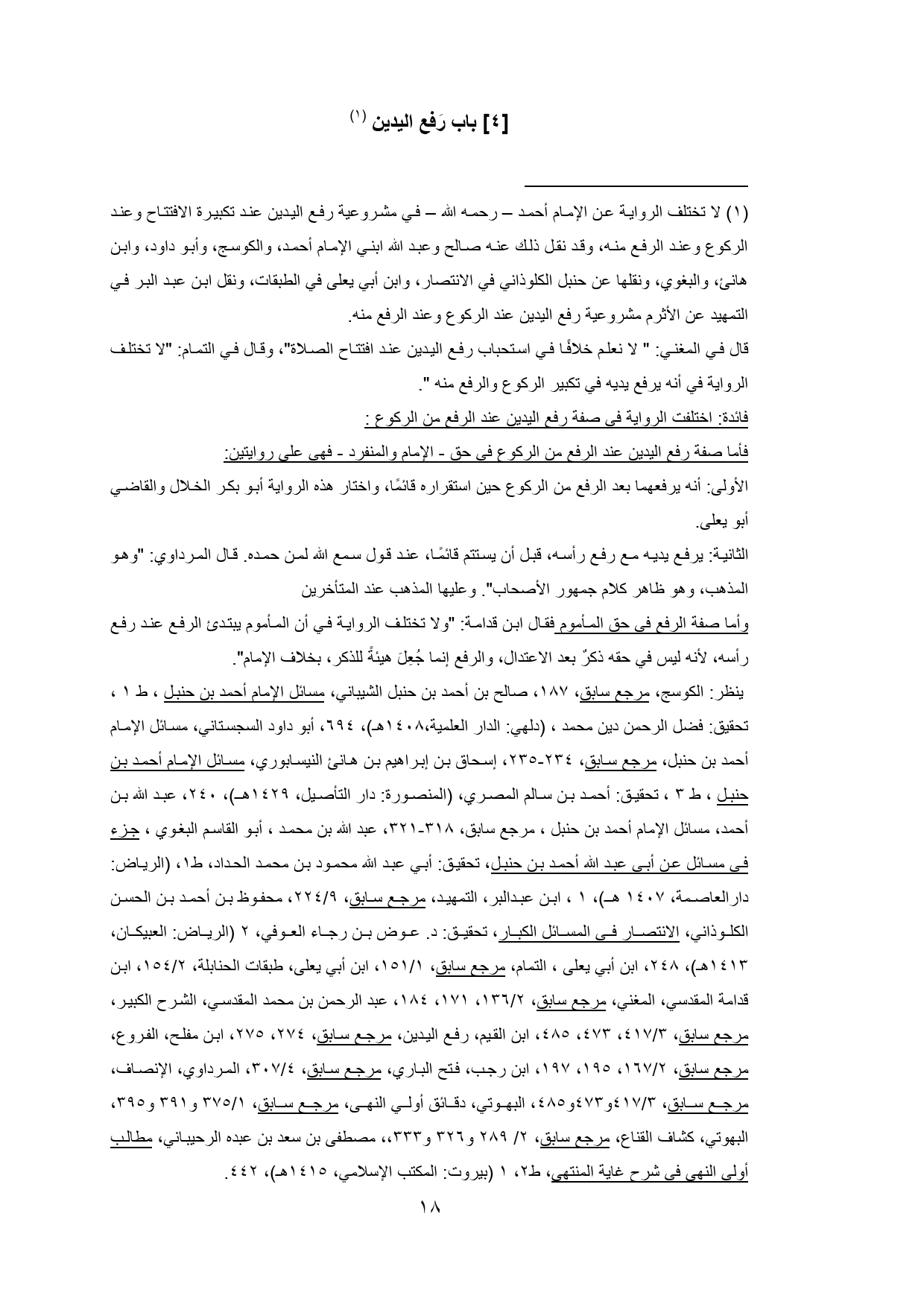 ينظر: الكوسج، مرجع سابق، 187، صالح بن أحمد بن حنبل الشيباني، مسائل الإمام أحمد بن حنبل , ط 1 , تحقيق: فضل الرحمن دين محمد , (دلهي: الدار العلمية،1408 هـ)، 694، أبو داود السجستاني، مسائل الإمام أحمد بن حنبل، مرجع سابق، 234 - 235، إسحاق بن إبراهيم بن هانئ النيسابوري، مسائل الإمام أحمد بن حنبل , ط 3 , تحقيق: أحمد بن سالم المصري, (المنصورة: دار التأصيل، 1429 هـ)، 240، عبد الله بن أحمد، مسائل الإمام أحمد بن حنبل , مرجع سابق، 318 - 321، عبد الله بن محمد , أبو القاسم البغوي، جزء في مسائل عن أبي عبد الله أحمد بن حنبل، تحقيق: أبي عبد الله محمود بن محمد الحداد، ط 1، (الرياض: دارالعاصمة، 1407 هـ)، 1 , ابن عبدالبر، التمهيد، مرجع سابق، 9/ 224, محفوظ بن أحمد بن الحسن الكلوذاني، الانتصار في المسائل الكبار، تحقيق: د. عوض بن رجاء العوفي، 2 (الرياض: العبيكان، 1413 هـ)، 248, ابن أبي يعلى، التمام، مرجع سابق، 1/ 151, ابن أبي يعلى، طبقات الحنابلة، 2/ 154, ابن قدامة المقدسي، المغني، مرجع سابق، 2/ 136، 171، 184, عبد الرحمن بن محمد المقدسي، الشرح الكبير، مرجع سابق، 3/ 417، 473، 485, ابن القيم، رفع اليدين، مرجع سابق، 274، 275, ابن مفلح، الفروع، مرجع سابق، 2/ 167، 195، 197, ابن رجب، فتح الباري، مرجع سابق، 4/ 307, المرداوي، الإنصاف، مرجع سابق، 3/ 417 و 473 و 485, البهوتي، دقائق أولي النهى، مرجع سابق، 1/ 375 و 391 و 395, البهوتي، كشاف القناع، مرجع سابق، 2/ 289 و 326 و 333,، مصطفى بن سعد بن عبده الرحيباني، مطالب أولي النهى في شرح غاية المنتهى, ط 2، 1 (بيروت: المكتب الإسلامي، 1415 هـ)، 442.