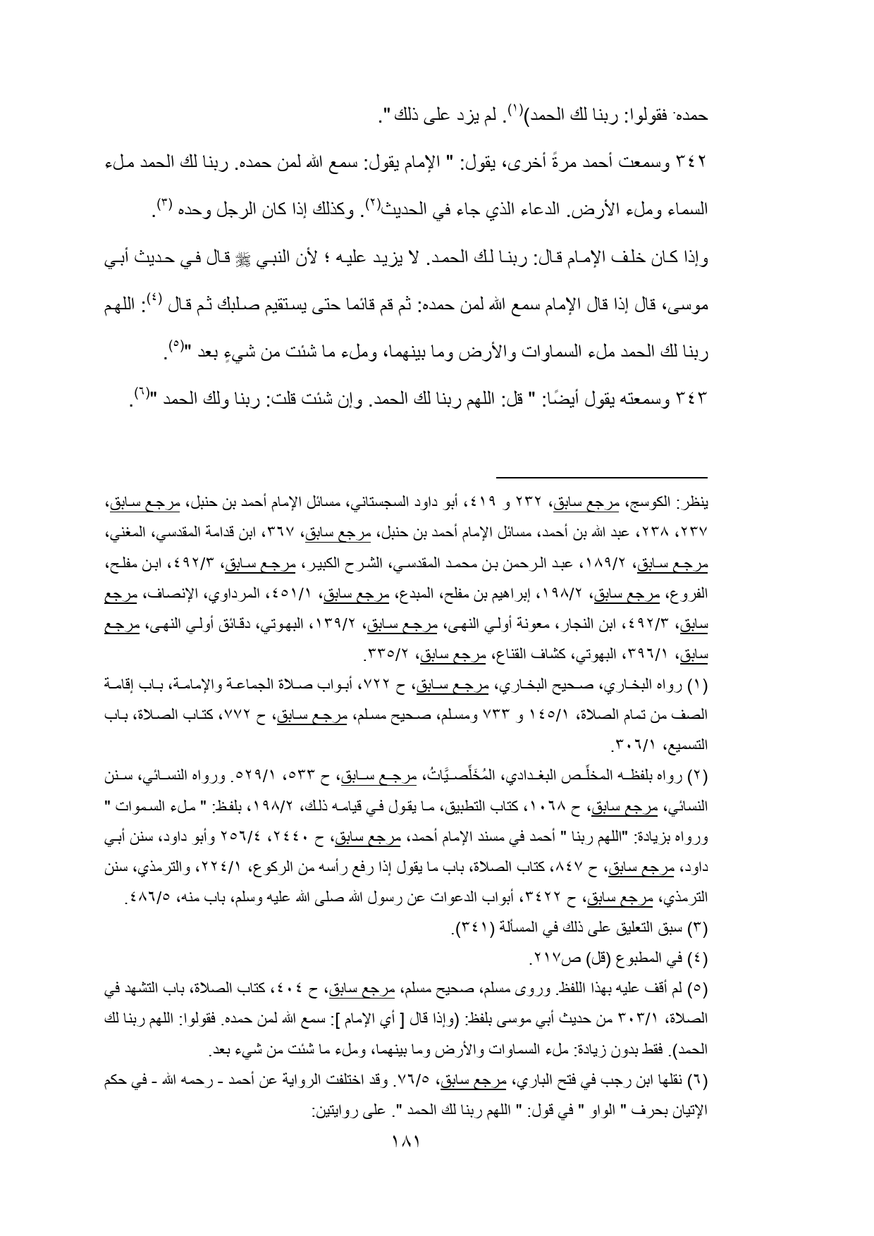 (¬6) نقلها ابن رجب في فتح الباري، مرجع سابق، 5/ 76. وقد اختلفت الرواية عن أحمد - رحمه الله - في حكم الإتيان بحرف " الواو " في قول: " اللهم ربنا لك الحمد ". على روايتين: