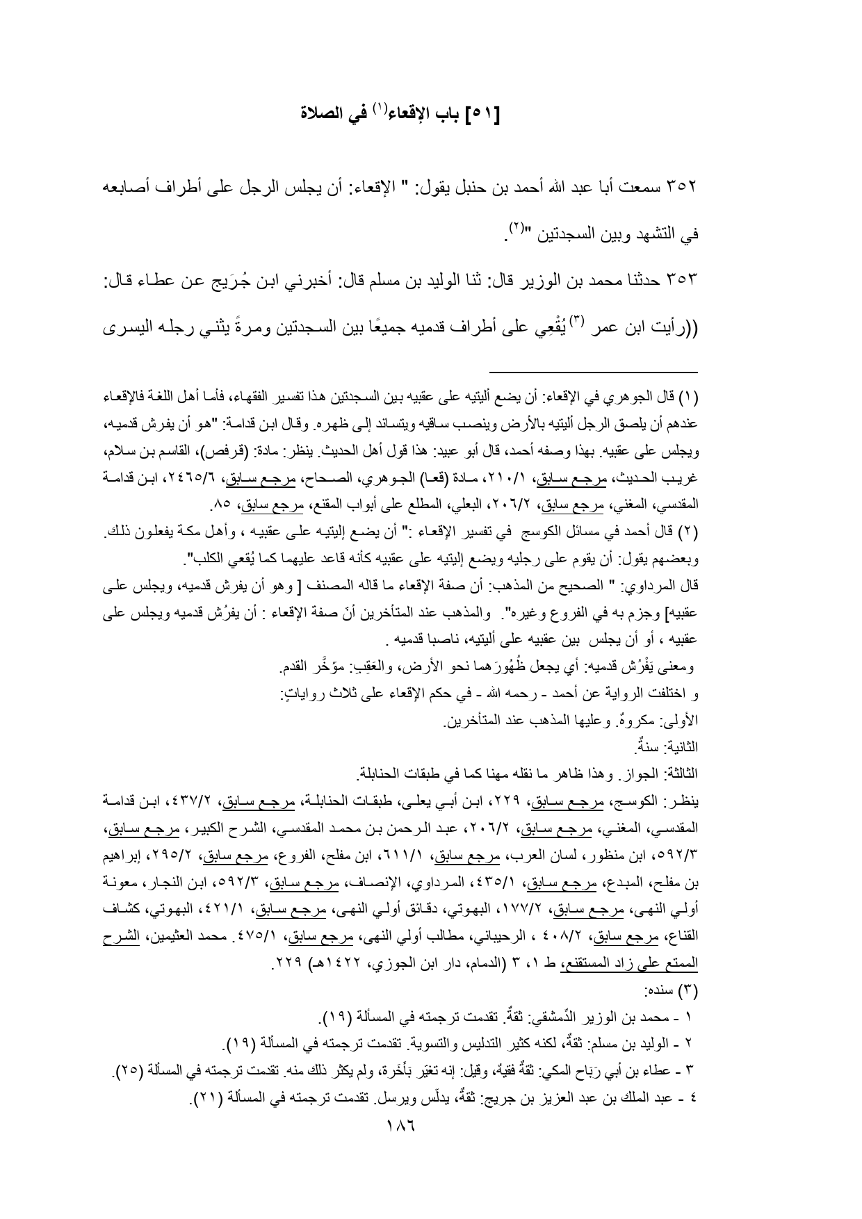352 - سمعت أبا عبد الله أحمد بن حنبل يقول: " الإقعاء: أن يجلس الرجل على أطراف أصابعه في التشهد وبين السجدتين " (¬2).