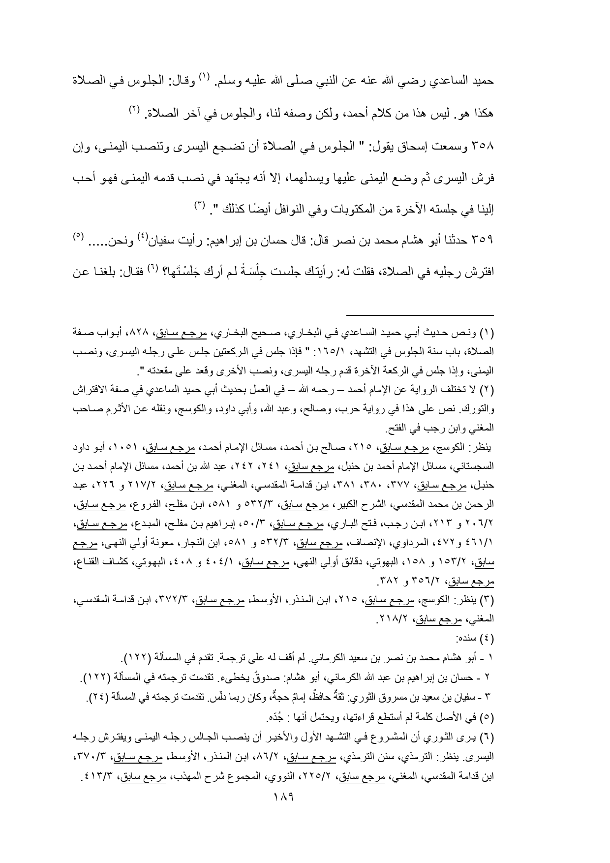 (¬2) لا تختلف الرواية عن الإمام أحمد - رحمه الله - في العمل بحديث أبي حميد الساعدي في صفة الافتراش والتورك. نص على هذا في رواية حرب، وصالح، وعبد الله، وأبي داود، والكوسج، ونقله عن الأثرم صاحب المغني وابن رجب في الفتح.