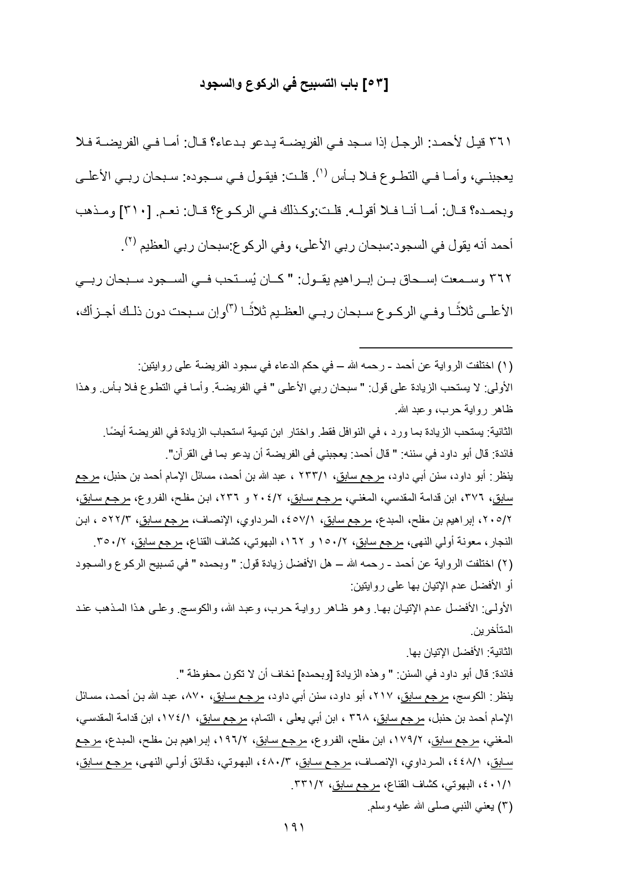 361 - قيل لأحمد: الرجل إذا سجد في الفريضة يدعو بدعاء؟ قال: أما في الفريضة فلا يعجبني، وأما في التطوع فلا بأس (¬1). قلت: فيقول في سجوده: سبحان ربي الأعلى وبحمده؟ قال: أما أنا فلا أقوله. قلت: وكذلك في الركوع؟ قال: نعم. [310] ومذهب أحمد أنه يقول في السجود: سبحان ربي الأعلى, وفي الركوع: سبحان ربي العظيم (¬2).