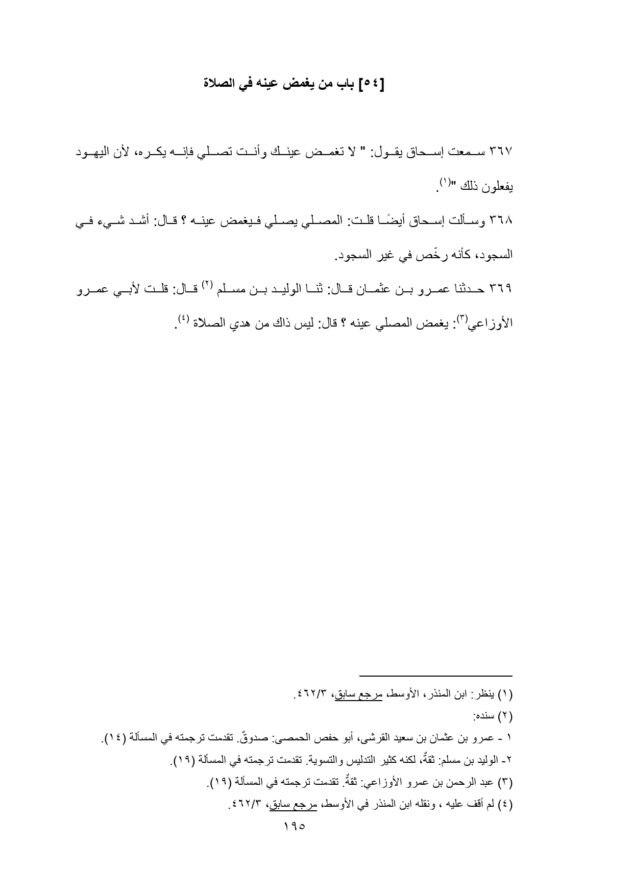 369 - حدثنا عمرو بن عثمان قال: ثنا الوليد بن مسلم (¬2) قال: قلت لأبي عمرو الأوزاعي (¬3): يغمض المصلي عينه؟ قال: ليس ذاك من هدي الصلاة (¬4).