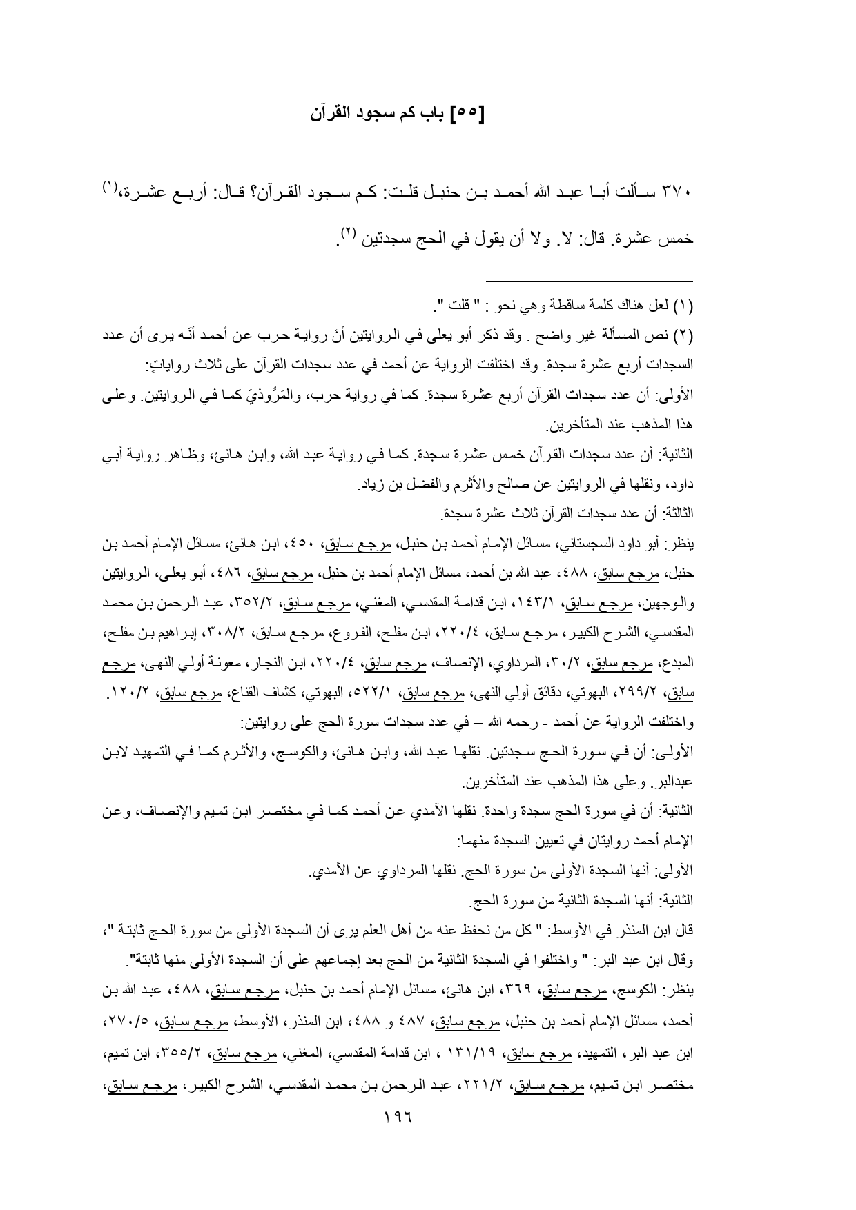 (¬2) نص المسألة غير واضح. وقد ذكر أبو يعلى في الروايتين أنّ رواية حرب عن أحمد أنّه يرى أن عدد السجدات أربع عشرة سجدة. وقد اختلفت الرواية عن أحمد في عدد سجدات القرآن على ثلاث رواياتٍ: