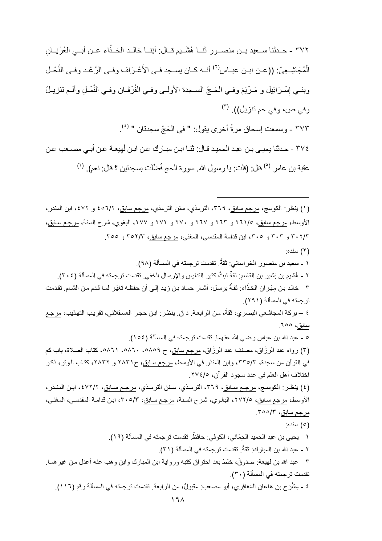 372 - حدثنا سعيد بن منصور ثنا هُشَيم قال: أبَنا خالد الحَذّاء عن أبي العُرْيَانِ الْمُجَاشِعِيّ: ((عن ابن عباس (¬1) أنه كان يسجد في الأَعْرَاف وفي الرَّعْد وفي النَّحْل وبني إِسْرَائِيل ومَرْيَمَ وفي الحَجّ السجدة الأولى وفي الفُرْقَان وفي النَّمْلِ وألم تنزيلُ وفي ص، وفي حم تنزيل)). (¬2)
