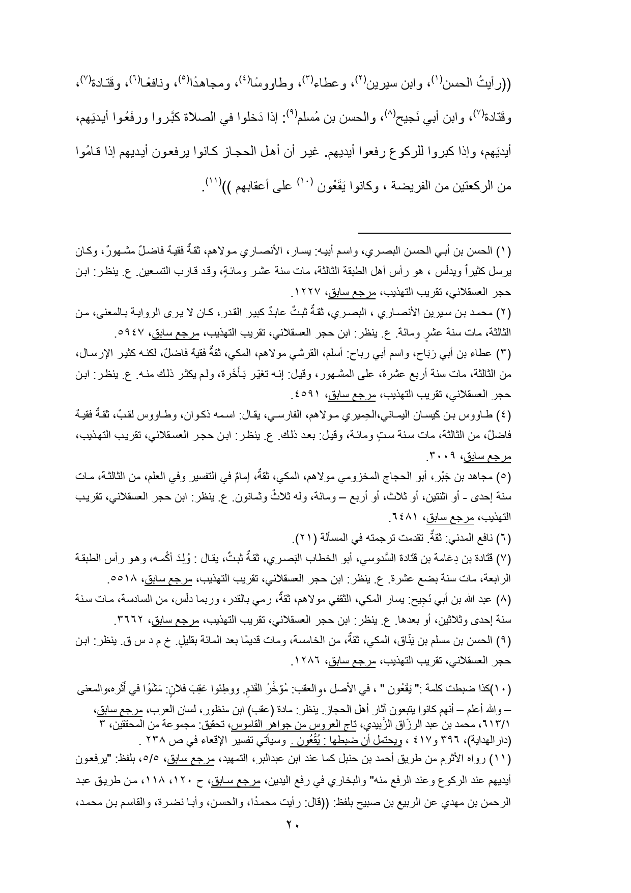 ((رأيتُ الحسن (¬1)، وابن سيرين (¬2)، وعطاء (¬3)، وطاووسًا (¬4)، ومجاهدًا (¬5)، ونافعًا (¬6) , وقَتادة (¬7)، وابن أبي نَجيح (¬8)، والحسن بن مُسلم (¬9): إذا دَخلوا في الصلاة كبَّروا ورفَعُوا أيديَهم، وإذا كبروا للركوع رفعوا أيديهم. غير أن أهل الحجاز كانوا يرفعون أيديهم إذا قامُوا من الركعتين من الفريضة , وكانوا يَقَعُون (¬10) على أعقابهم)) (¬11).