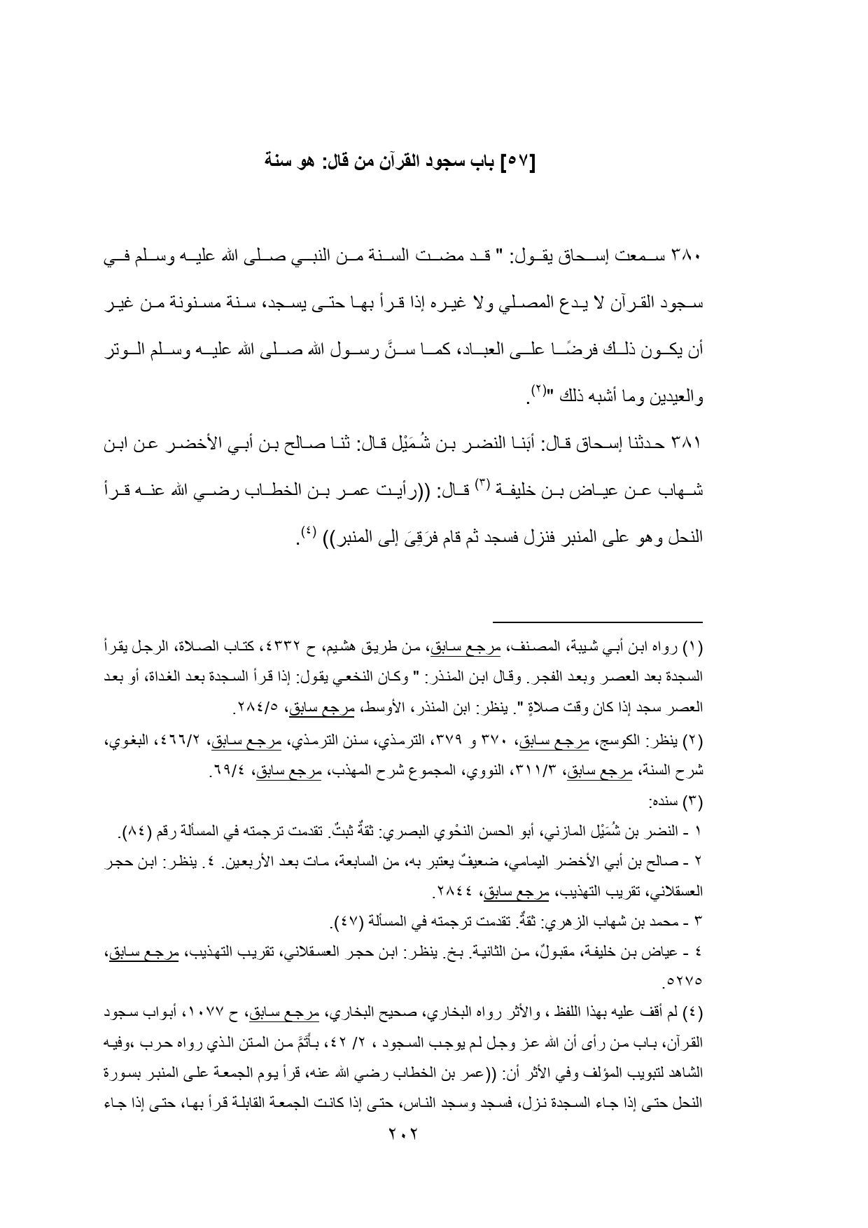 381 - حدثنا إسحاق قال: أبَنا النضر بن شُمَيْل قال: ثنا صالح بن أبي الأخضر عن ابن شهاب عن عياض بن خليفة (¬2) قال: ((رأيت عمر بن الخطاب رضي الله عنه قرأ النحل وهو على المنبر فنزل فسجد ثم قام فرَقِىَ إلى المنبر)) (¬3).