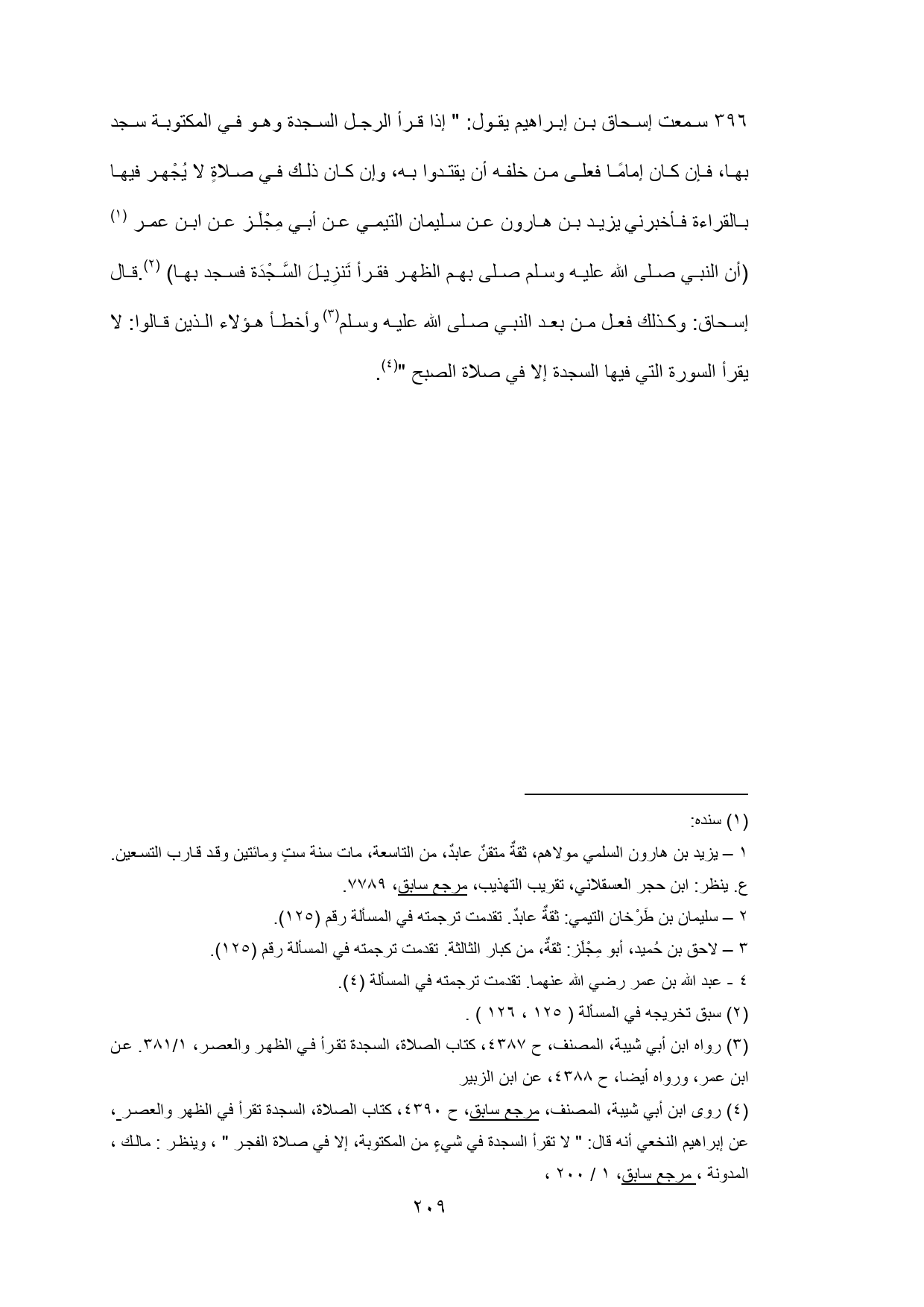 396 - سمعت إسحاق بن إبراهيم يقول: " إذا قرأ الرجل السجدة وهو في المكتوبة سجد بها، فإن كان إمامًا فعلى من خلفه أن يقتدوا به، وإن كان ذلك في صلاةٍ لا يُجْهر فيها بالقراءة فأخبرني يزيد بن هارون عن سليمان التيمي عن أبي مِجْلَز عن ابن عمر (¬1) (أن النبي صلى الله عليه وسلم صلى بهم الظهر فقرأ تَنزِيلَ السَّجْدَة فسجد بها) (¬2).قال إسحاق: وكذلك فعل من بعد النبي صلى الله عليه وسلم (¬3) وأخطأ هؤلاء الذين قالوا: لا يقرأ السورة التي فيها السجدة إلا في صلاة الصبح " (¬4).