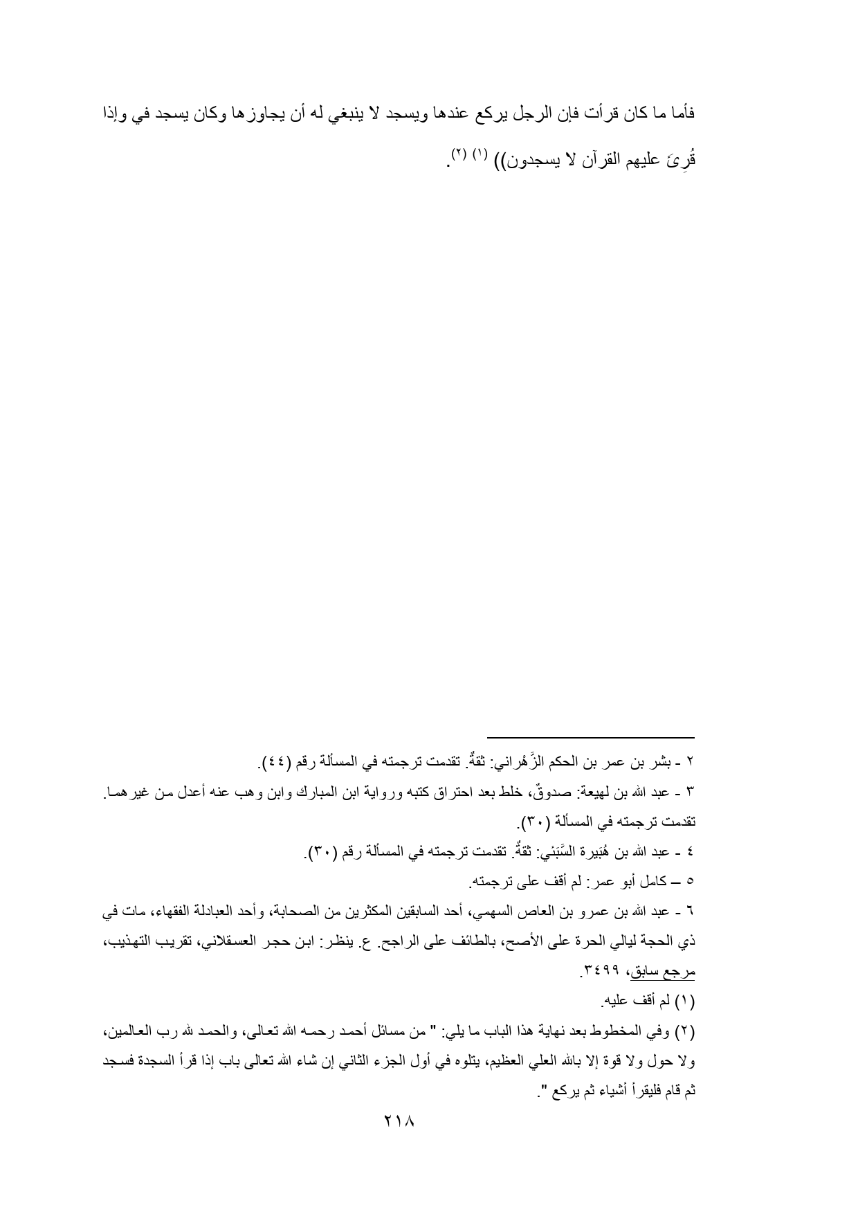 (¬2) وفي المخطوط بعد نهاية هذا الباب ما يلي: " من مسائل أحمد رحمه الله تعالى، والحمد لله رب العالمين، ولا حول ولا قوة إلا بالله العلي العظيم، يتلوه في أول الجزء الثاني إن شاء الله تعالى باب إذا قرأ السجدة فسجد ثم قام فليقرأ أشياء ثم يركع ".