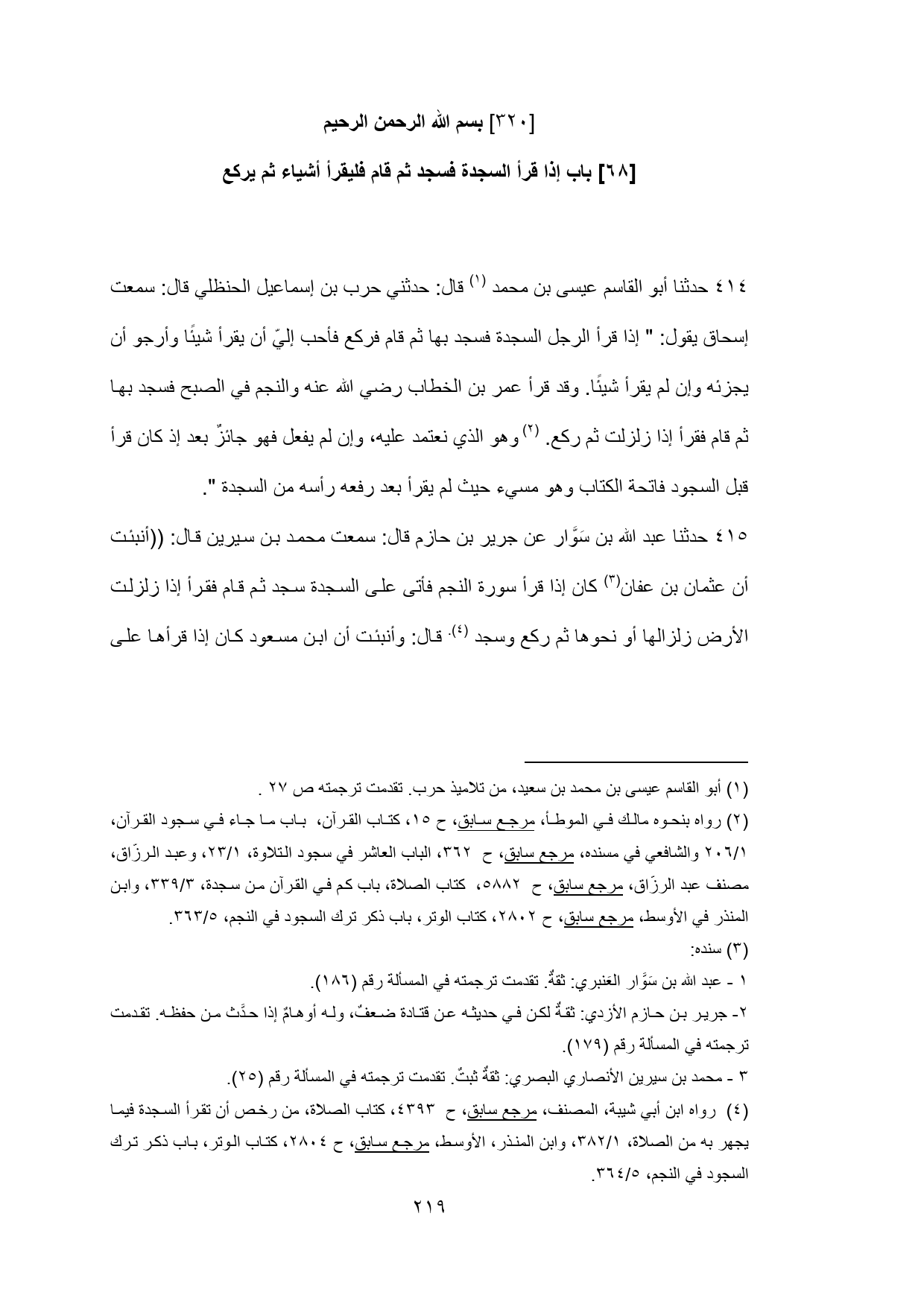 415 - حدثنا عبد الله بن سَوَّار عن جرير بن حازم قال: سمعت محمد بن سيرين قال: ((أنبئت أن عثمان بن عفان (¬3) كان إذا قرأ سورة النجم فأتى على السجدة سجد ثم قام فقرأ إذا زلزلت