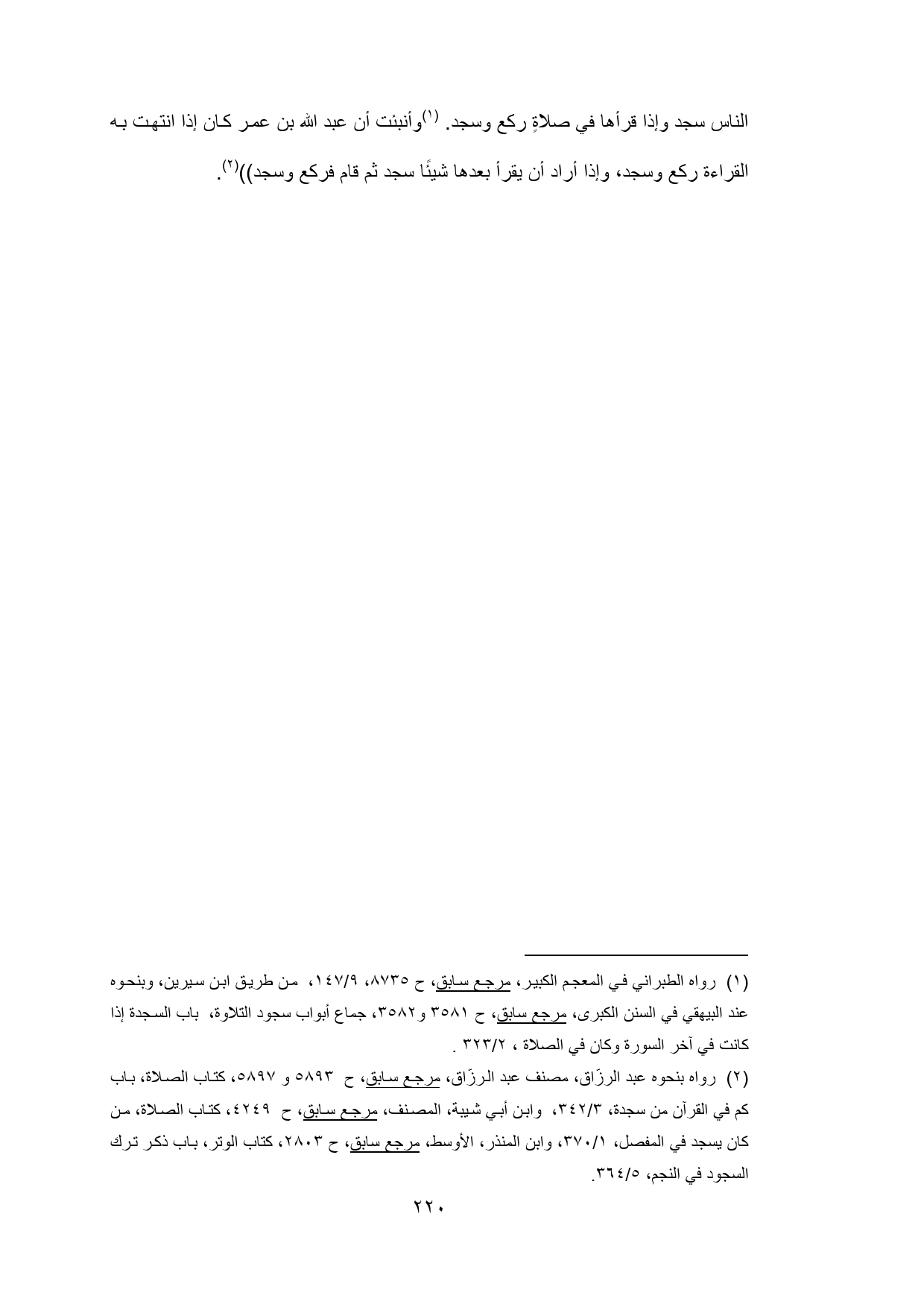 (¬1) رواه الطبراني في المعجم الكبير، مرجع سابق، ح 8735، 9/ 147، من طريق ابن سيرين، وبنحوه عند البيهقي في السنن الكبرى، مرجع سابق، ح 3581 و 3582، جماع أبواب سجود التلاوة، باب السجدة إذا كانت في آخر السورة وكان في الصلاة، 2/ 323.