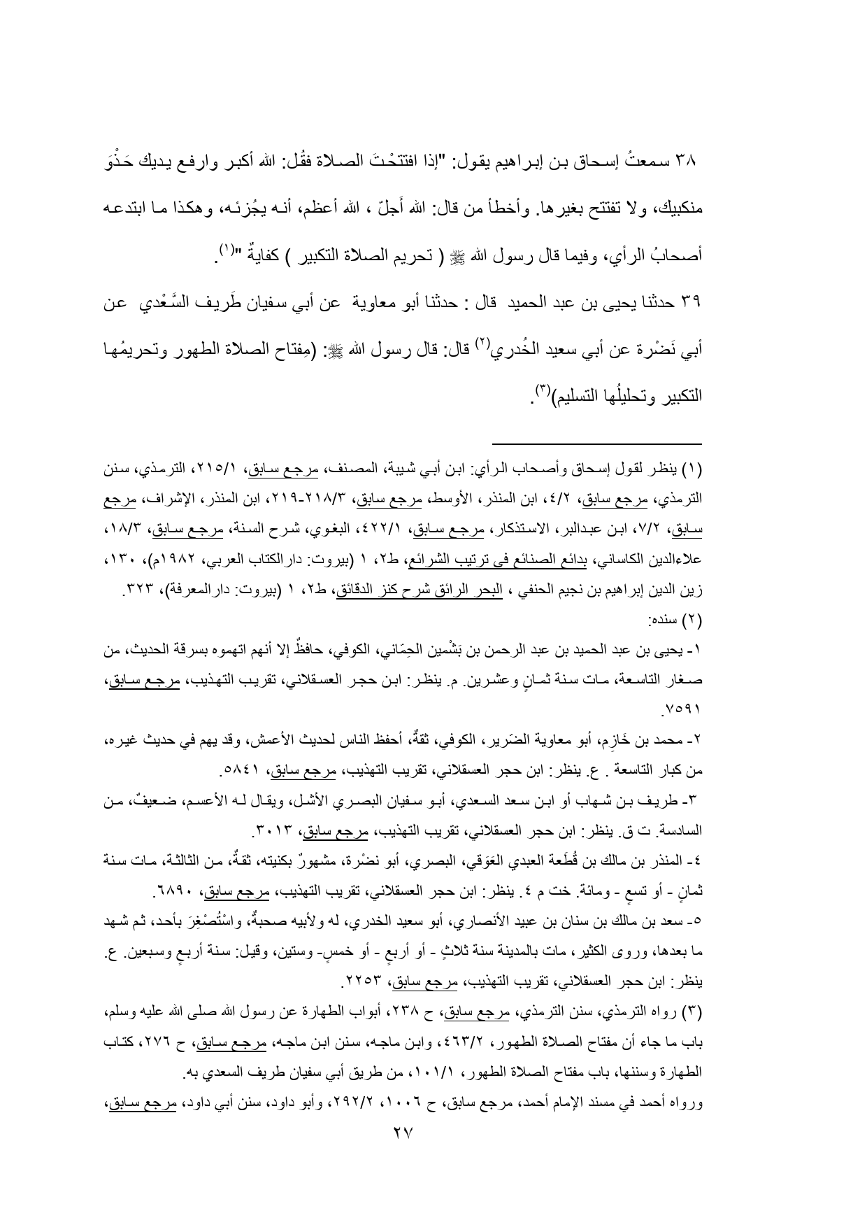 (¬3) رواه الترمذي، سنن الترمذي، مرجع سابق، ح 238، أبواب الطهارة عن رسول الله صلى الله عليه وسلم، باب ما جاء أن مفتاح الصلاة الطهور، 2/ 463، وابن ماجه، سنن ابن ماجه، مرجع سابق، ح 276، كتاب الطهارة وسننها، باب مفتاح الصلاة الطهور، 1/ 101، من طريق أبي سفيان طريف السعدي به.