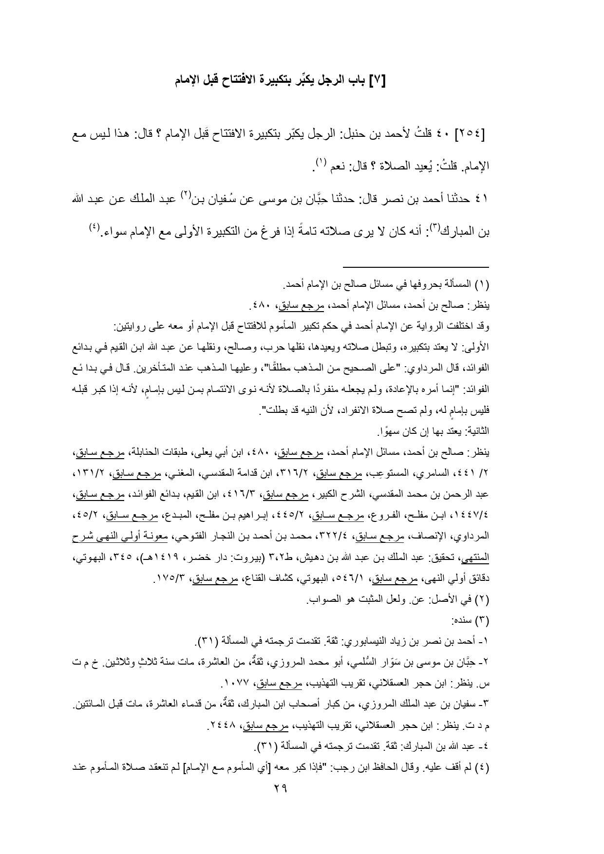 40 - قلتُ لأحمد بن حنبل: الرجل يكبّر بتكبيرة الافتتاح قَبل الإمام؟ قال: هذا ليس مع الإمام. قلتُ: يُعيد الصلاة؟ قال: نعم (¬1).