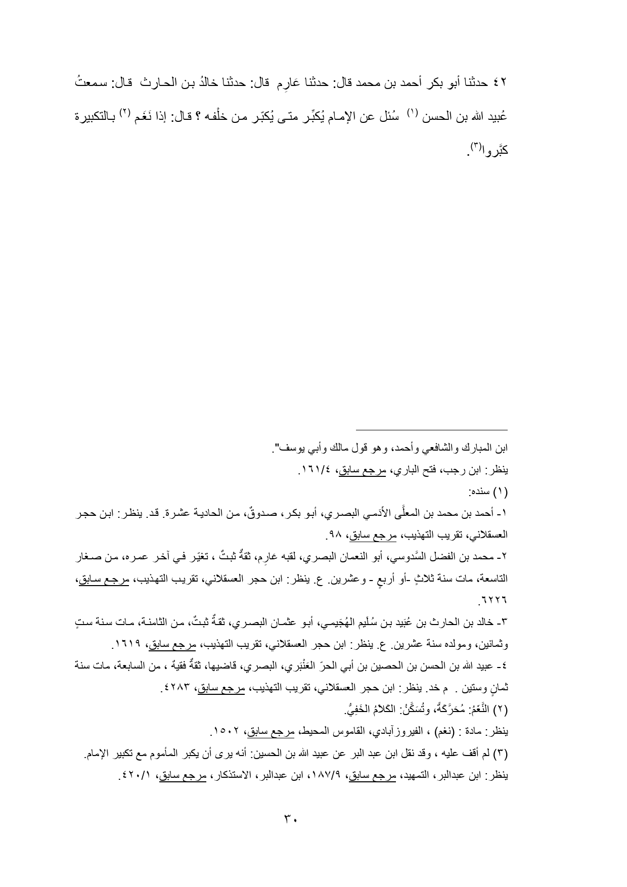 42 - حدثنا أبو بكر أحمد بن محمد قال: حدثنا عَارِم قال: حدثنا خالدُ بن الحارث قال: سمعتُ عُبيد الله بن الحسن (¬1) سُئل عن الإمام يُكبِّر متى يُكبّر من خلْفه؟ قال: إذا نَغَم (¬2) بالتكبيرة كبَّروا (¬3).