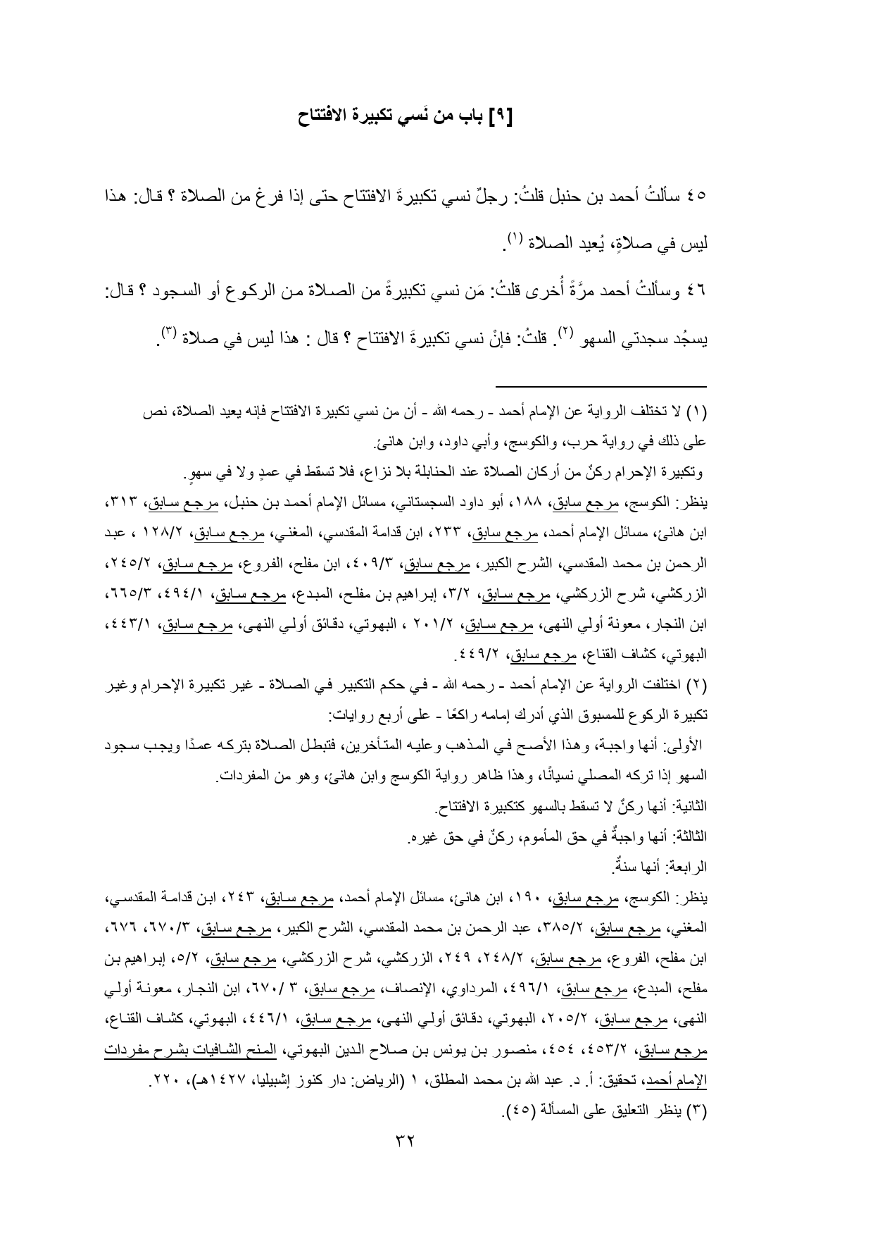 45 - سألتُ أحمد بن حنبل قلتُ: رجلٌ نسي تكبيرةَ الافتتاح حتى إذا فرغ من الصلاة؟ قال: هذا ليس في صلاةٍ، يُعيد الصلاة (¬1).