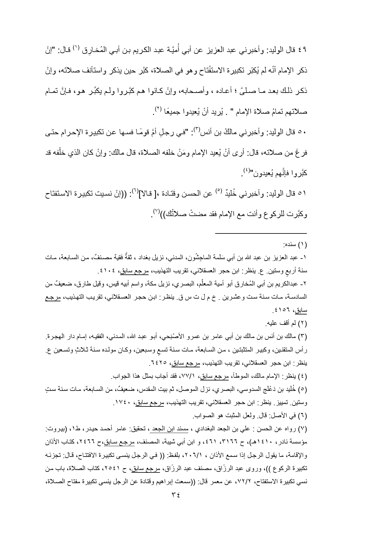 50 - قال الوليد: وأخبرني مالكُ بن أنس (¬3): "في رجلٍ أمَّ قومًا فسها عن تكبيرة الإحرام حتى فرغ من صلاته، قال: أرى أنْ يُعيد الإمام ومَنْ خلفه الصلاة، قال مالك: وإنْ كان الذي خلْفه قد كبَّروا فإنَّهم يُعيدون" (¬4).