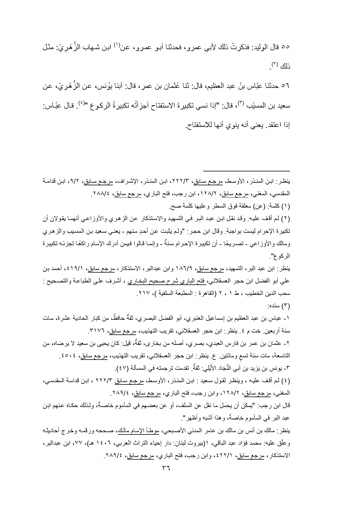 ينظر: ابن عبد البر، التمهيد، مرجع سابق، 9/ 186 وابن عبدالبر، الاستذكار، مرجع سابق، 1/ 419، أحمد بن علي أبو الفضل ابن حجر العسقلاني، فتح الباري شرح صحيح البخاري، أشرف على الطباعة والتصحيح: محب الدين الخطيب , ط 1 , 2 (القاهرة: المطبعة السلفية)، 217.