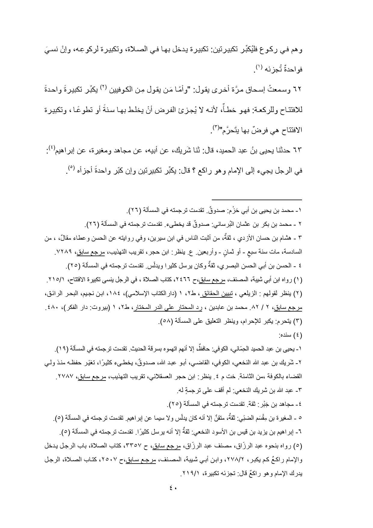 (¬5) رواه بنحوه عبد الرزّاق، مصنف عبد الرزّاق، مرجع سابق، ح 3357، كتاب الصلاة، باب الرجل يدخل والإمام راكعٌ كم يكبر، 2/ 278، وابن أبي شيبة، المصنف، مرجع سابق، ح 2507، كتاب الصلاة، الرجل يدرك الإمام وهو راكعٌ قال: تجزئه تكبيرة، 1/ 219.