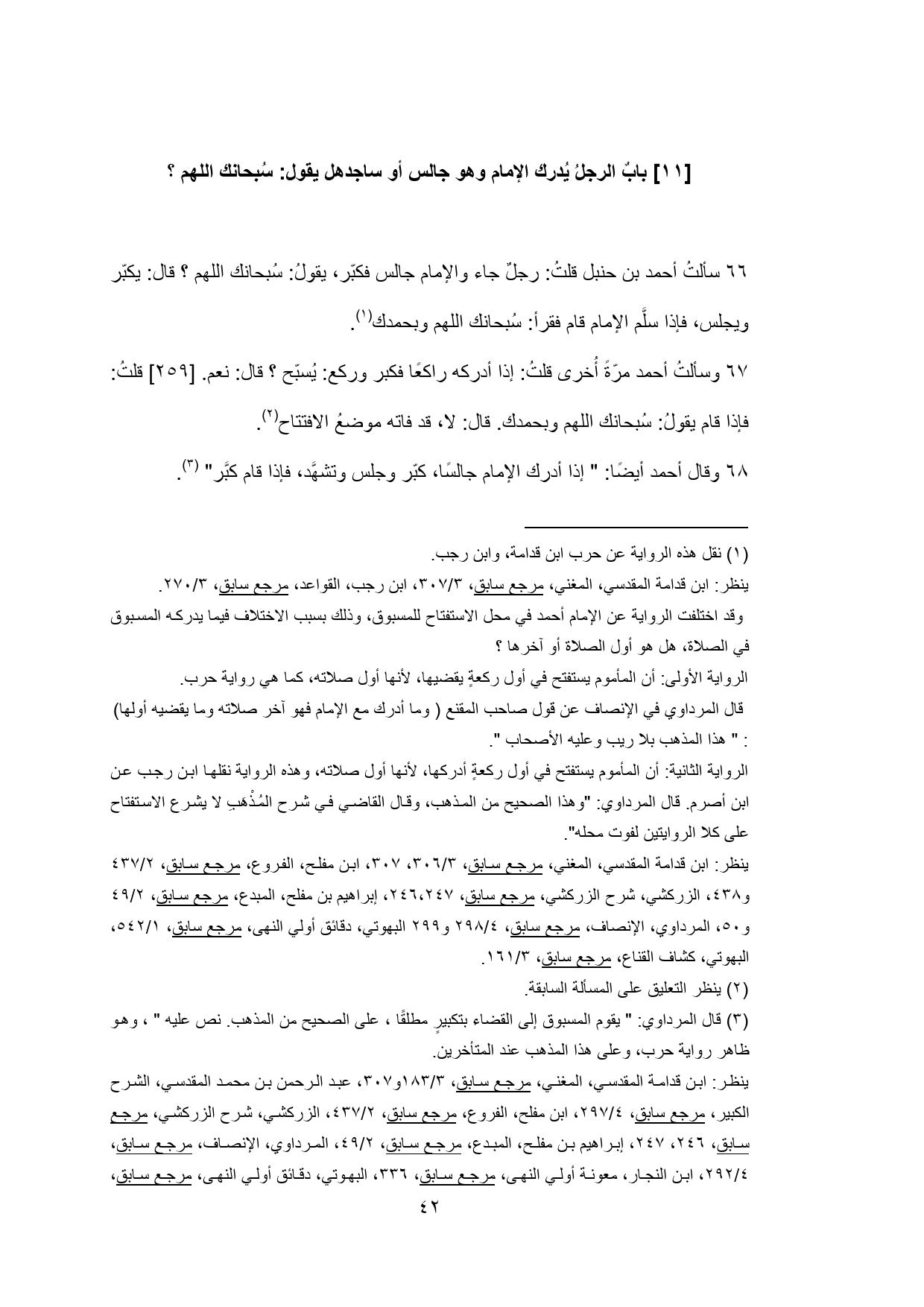 66 - سألتُ أحمد بن حنبل قلتُ: رجلٌ جاء والإمام جالس فكبّر، يقولُ: سُبحانك اللهم؟ قال: يكبّر ويجلس، فإذا سلَّم الإمام قام فقرأ: سُبحانك اللهم وبحمدك (¬1).