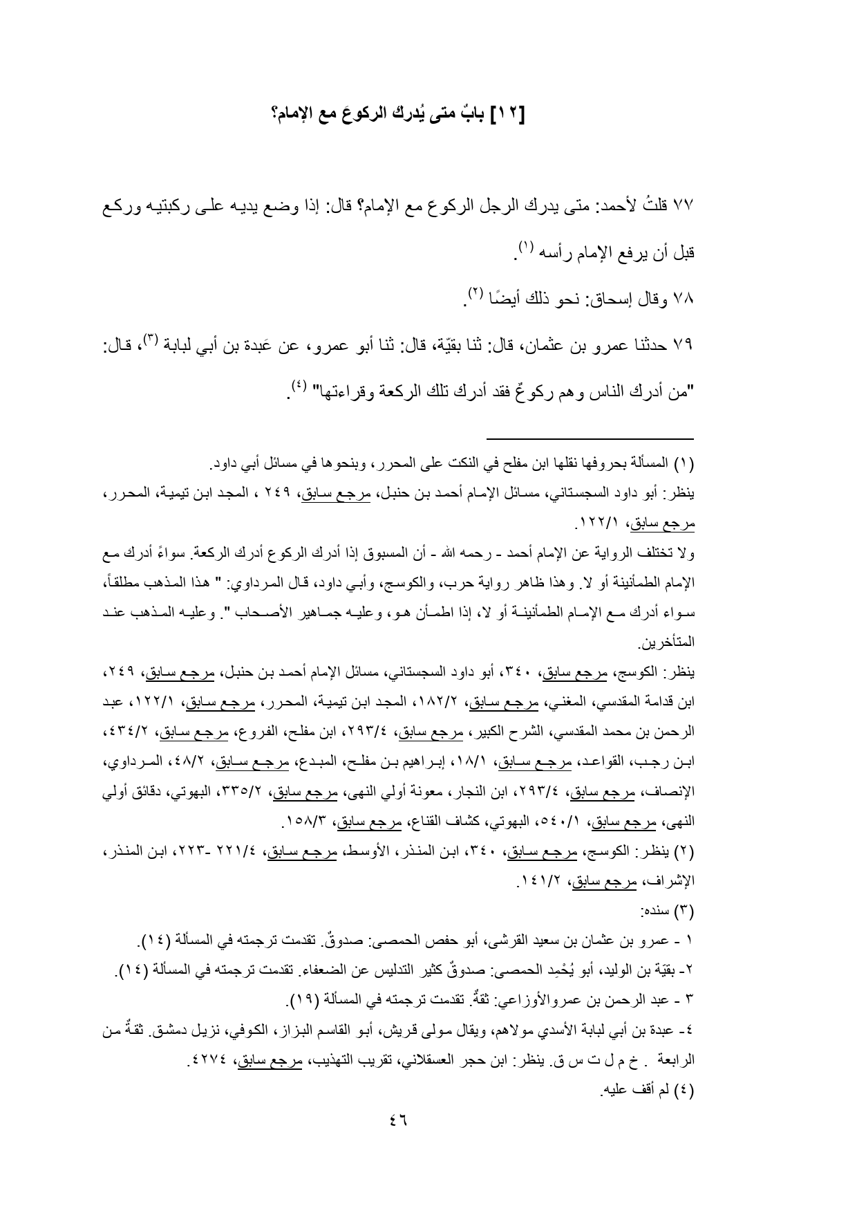 79 - حدثنا عمرو بن عثمان، قال: ثنا بقيّة، قال: ثنا أبو عمرو، عن عَبدة بن أبي لبابة (¬3)، قال: "من أدرك الناس وهم ركوعٌ فقد أدرك تلك الركعة وقراءتها" (¬4).
