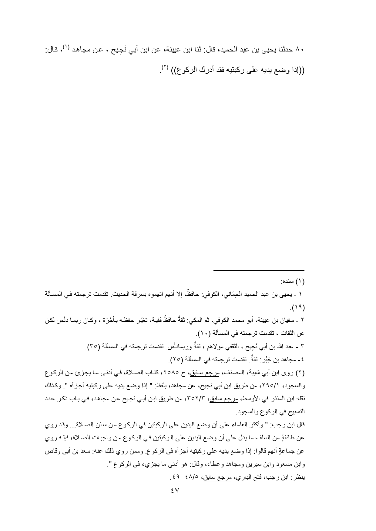 80 - حدثنا يحيى بن عبد الحميد، قال: ثنا ابن عيينة، عن ابن أبي نَجِيح، عن مجاهد (¬1)، قال: ((إذا وضع يديه على ركبتيه فقد أدرك الركوع)) (¬2).