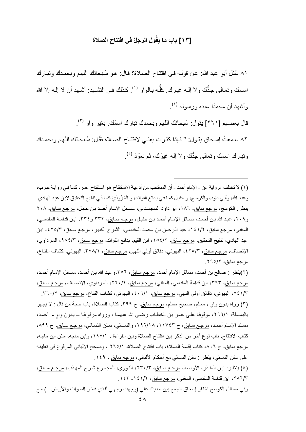 81 - سُئل أبو عبد الله: عن قوله في افتتاح الصلاة؟ قال: هو سُبحانك اللهم وبحمدك وتبارك اسمك وتعالى جدُّك ولا إله غيرك. كلُّه بالواو (¬1). كذلك في التشهد: أشهد أن لا إله إلا الله وأشهد أن محمدًا عبده ورسوله (¬2).