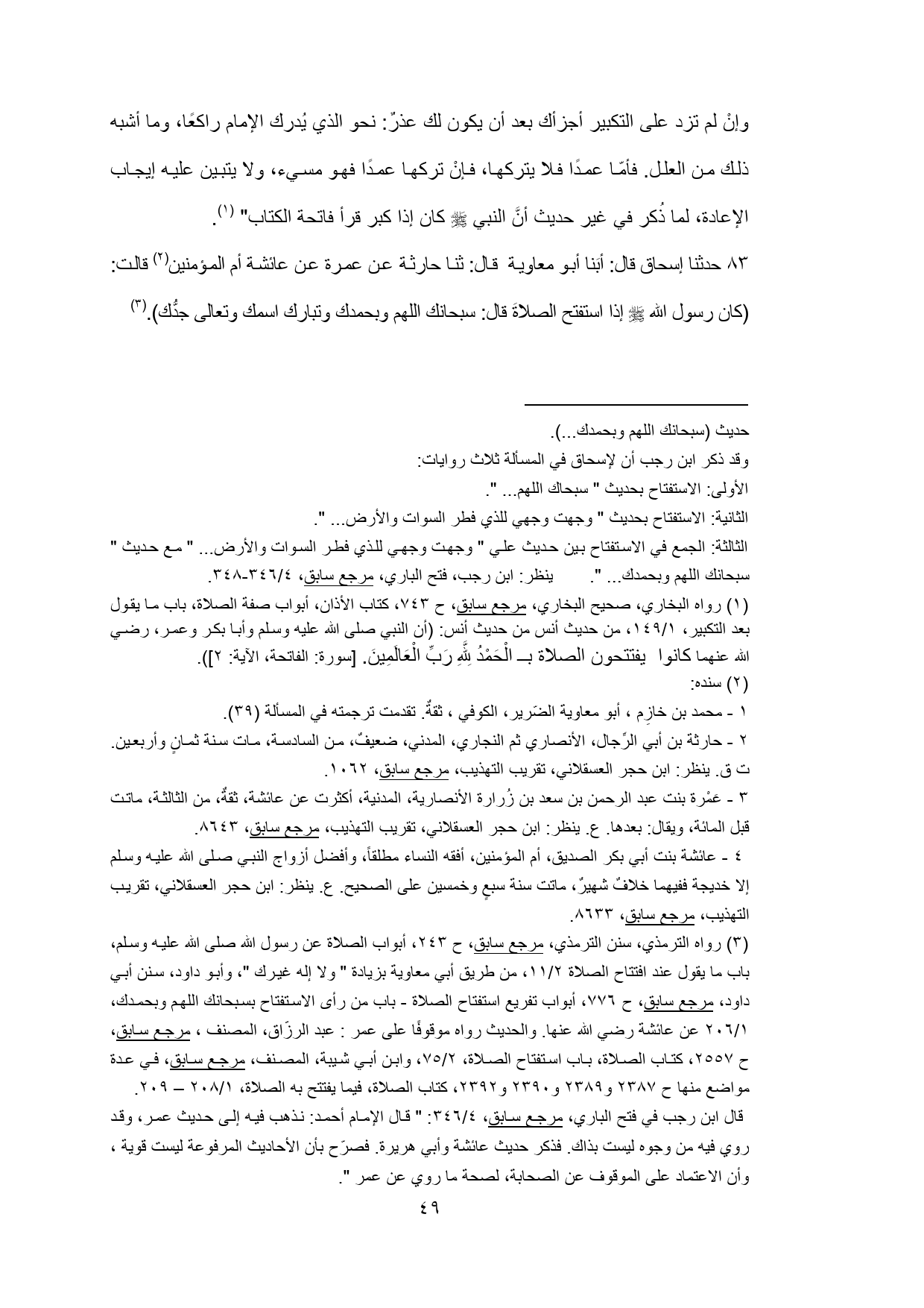 (¬3) رواه الترمذي، سنن الترمذي، مرجع سابق، ح 243، أبواب الصلاة عن رسول الله صلى الله عليه وسلم، باب ما يقول عند افتتاح الصلاة 2/ 11، من طريق أبي معاوية بزيادة " ولا إله غيرك "، وأبو داود، سنن أبي داود، مرجع سابق، ح 776، أبواب تفريع استفتاح الصلاة - باب من رأى الاستفتاح بسبحانك اللهم وبحمدك، 1/ 206 عن عائشة رضي الله عنها. والحديث رواه موقوفًا على عمر: عبد الرزّاق، المصنف، مرجع سابق، ح 2557, كتاب الصلاة، باب استفتاح الصلاة، 2/ 75، وابن أبي شيبة، المصنف، مرجع سابق, في عدة مواضع منها ح 2387 و 2389 و 2390 و 2392، كتاب الصلاة، فيما يفتتح به الصلاة، 1/ 208 - 209.