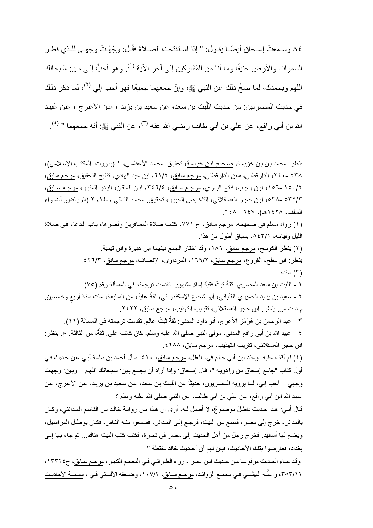 (¬4) لم أقف عليه. وعند ابن أبي حاتم في، العلل، مرجع سابق، 410: سأل أحمد بن سلمة أبي عن حديث في أول كتاب "جامع إسحاق بن راهويه ", قال إسحاق: وإذا أراد أن يجمع بين: سبحانك اللهم ... وبين: وجهت وجهي ... أحب إلي، لما يرويه المصريون، حديثاً عن الليث بن سعد، عن سعيد بن يزيد، عن الأعرج، عن عبيد الله ابن أبي رافع، عن علي بن أبي طالب، عن النبي صلى الله عليه وسلم؟
