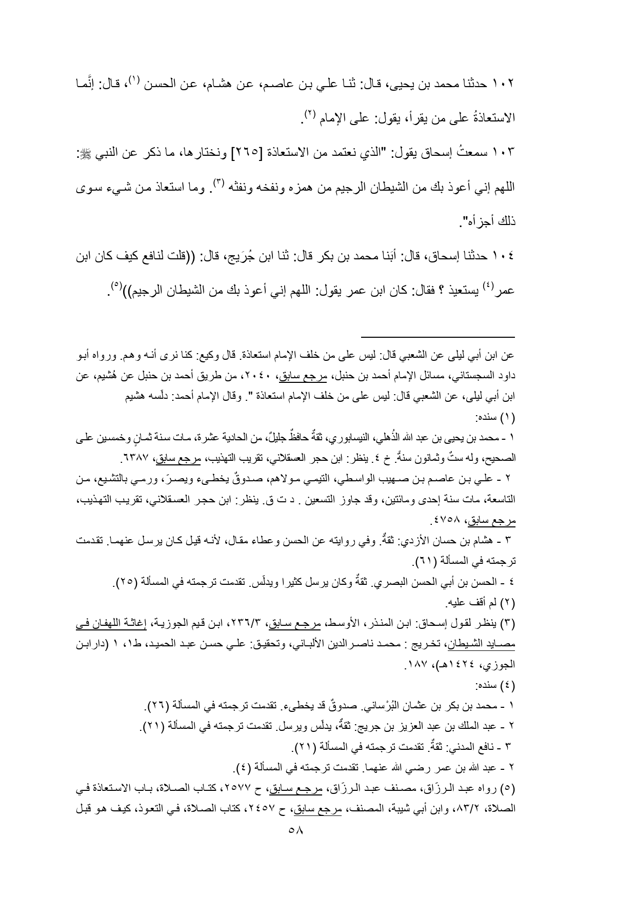 (¬5) رواه عبد الرزّاق، مصنف عبد الرزّاق، مرجع سابق، ح 2577، كتاب الصلاة، باب الاستعاذة في الصلاة, 2/ 83، وابن أبي شيبة، المصنف، مرجع سابق، ح 2457، كتاب الصلاة، في التعوذ, كيف هو قبل القراءة أو بعدها؟، 1/ 214، من طريق ابن جريج.