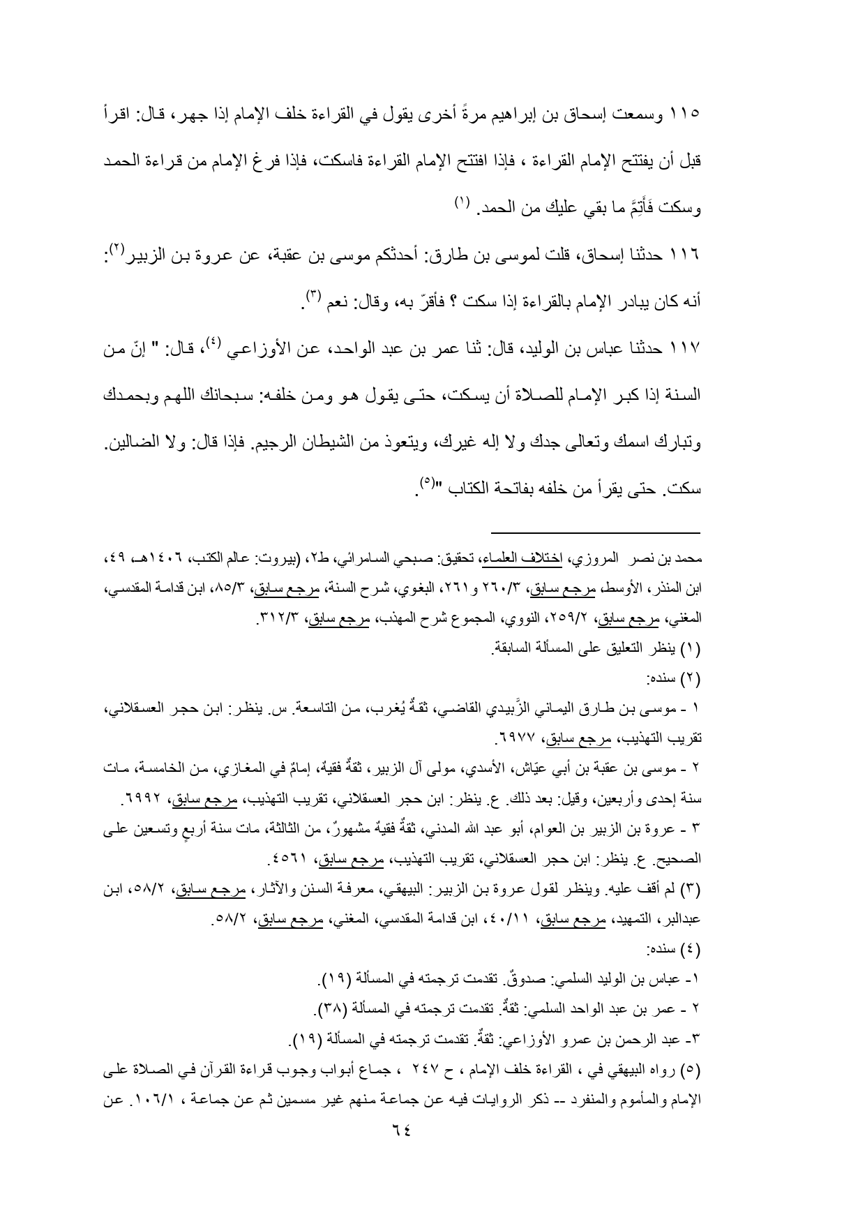 116 - حدثنا إسحاق، قلت لموسى بن طارق: أحدثكم موسى بن عقبة، عن عروة بن الزبير (¬2): أنه كان يبادر الإمام بالقراءة إذا سكت؟ فأقرّ به، وقال: نعم (¬3).