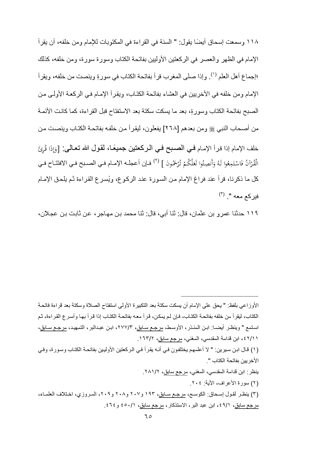 118 - وسمعت إسحاق أيضًا يقول: " السنة في القراءة في المكتوبات للإمام ومن خلفه، أن يقرأ الإمام في الظهر والعصر في الركعتين الأوليين بفاتحة الكتاب وسورة سورة، ومن خلفه، كذلك؛ إجماع أهل العلم (¬1). وإذا صلى المغرب قرأ بفاتحة الكتاب في سورةٍ وينصت من خلفه، ويقرأ الإمام ومن خلفه في الأخريين في العشاء بفاتحة الكتاب، ويقرأ الإمام في الركعة الأولى من الصبح بفاتحة الكتاب وسورةٍ، بعد ما يسكت سكتة بعد الاستفتاح قبل القراءة، كما كانت الأئمة من أصحاب النبي - صلى الله عليه وسلم - ومن بعدهم [268] يفعلون، ليقرأ من خلفه بفاتحة الكتاب وينصت من