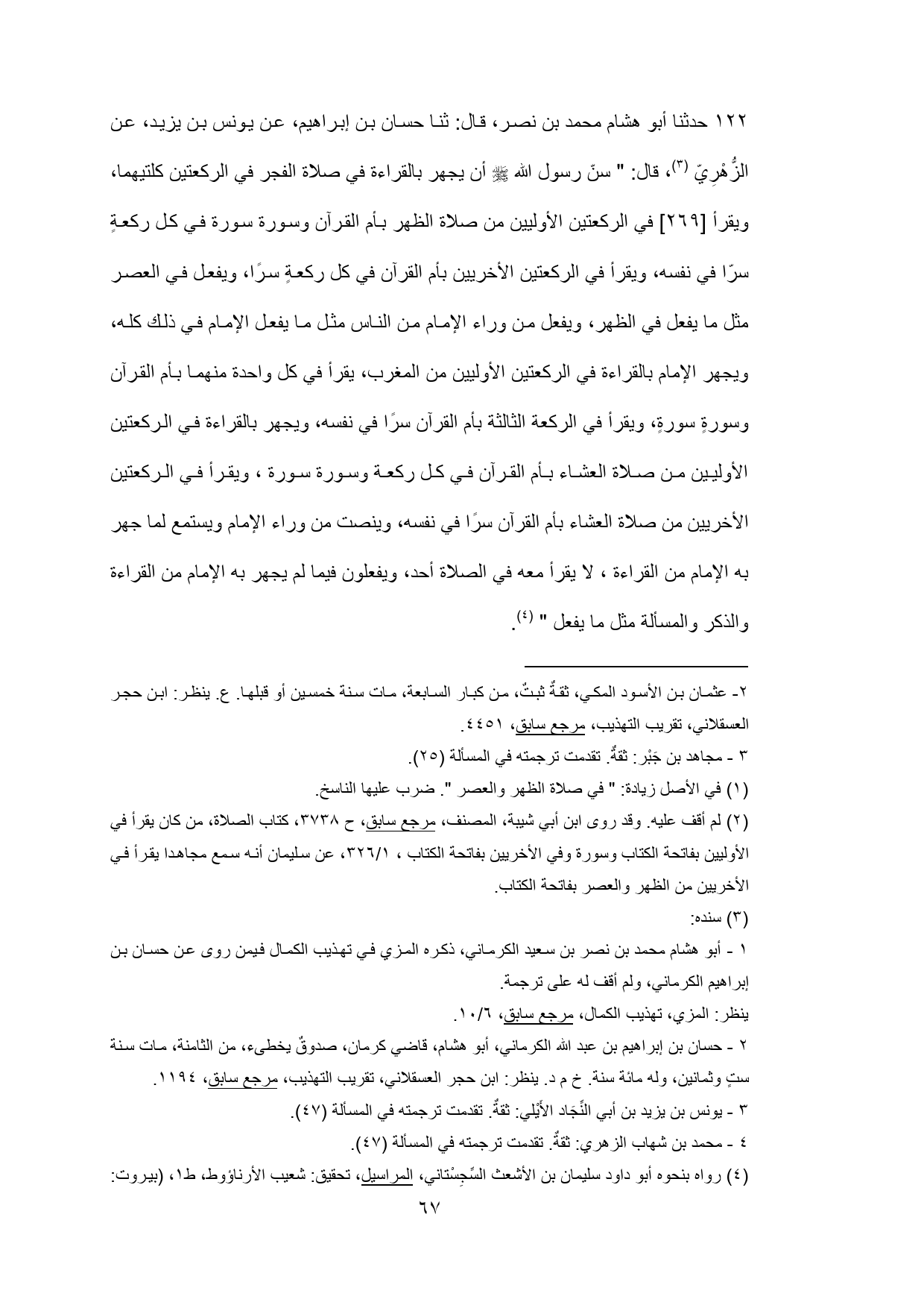 122 - حدثنا أبو هشام محمد بن نصر، قال: ثنا حسان بن إبراهيم، عن يونس بن يزيد، عن الزُّهْرِيّ (¬1)، قال: " سنّ رسول الله - صلى الله عليه وسلم - أن يجهر بالقراءة في صلاة الفجر في الركعتين كلتيهما، ويقرأ [269] في الركعتين الأوليين من صلاة الظهر بأم القرآن وسورة سورة في كل ركعةٍ سرّا في نفسه، ويقرأ في الركعتين الأخريين بأم القرآن في كل ركعةٍ سرًا، ويفعل في العصر مثل ما يفعل في الظهر، ويفعل من وراء الإمام من الناس مثل ما يفعل الإمام في