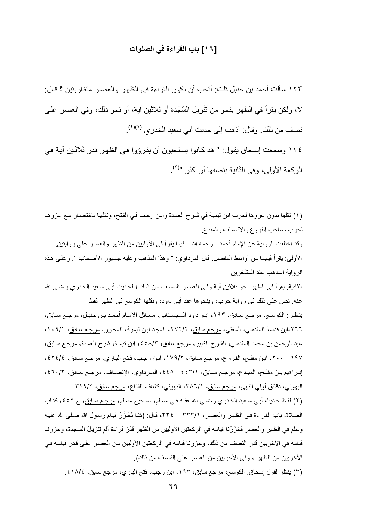 123 - سألت أحمد بن حنبل قلت: أتحب أن تكون القراءة في الظهر والعصر متقاربتين؟ قال: لا، ولكن يقرأ في الظهر بنحو من تَنْزيل السّجْدة أو ثلاثين آية، أو نحو ذلك، وفي العصر على نصفٍ من ذلك. وقال: أذهب إلى حديث أبي سعيد الخدري (¬1) (¬2).