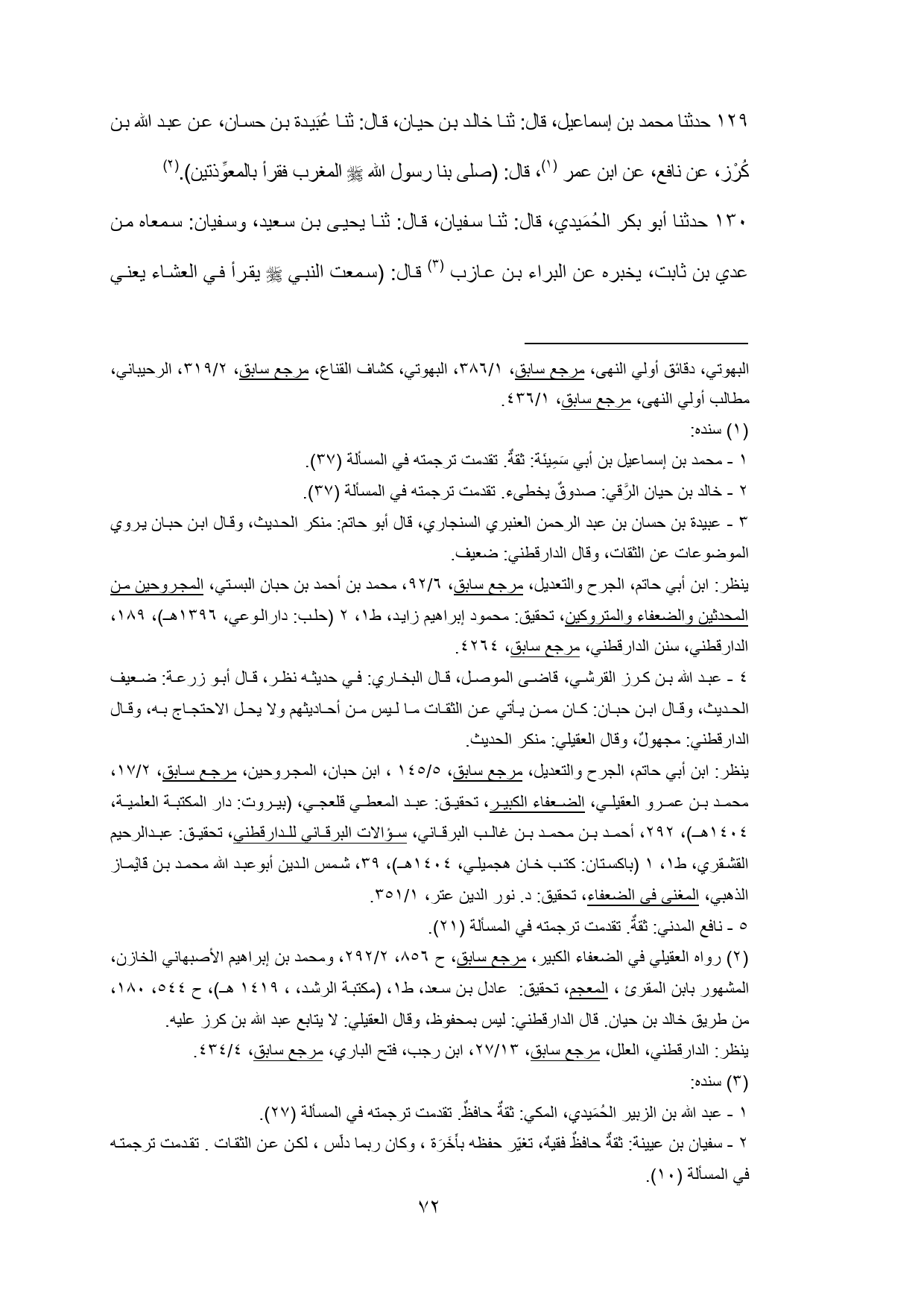 129 - حدثنا محمد بن إسماعيل، قال: ثنا خالد بن حيان، قال: ثنا عُبَيدة بن حسان، عن عبد الله بن كُرْز، عن نافع، عن ابن عمر (¬1)، قال: (صلى بنا رسول الله - صلى الله عليه وسلم - المغرب فقرأ بالمعوِّذتين). (¬2)