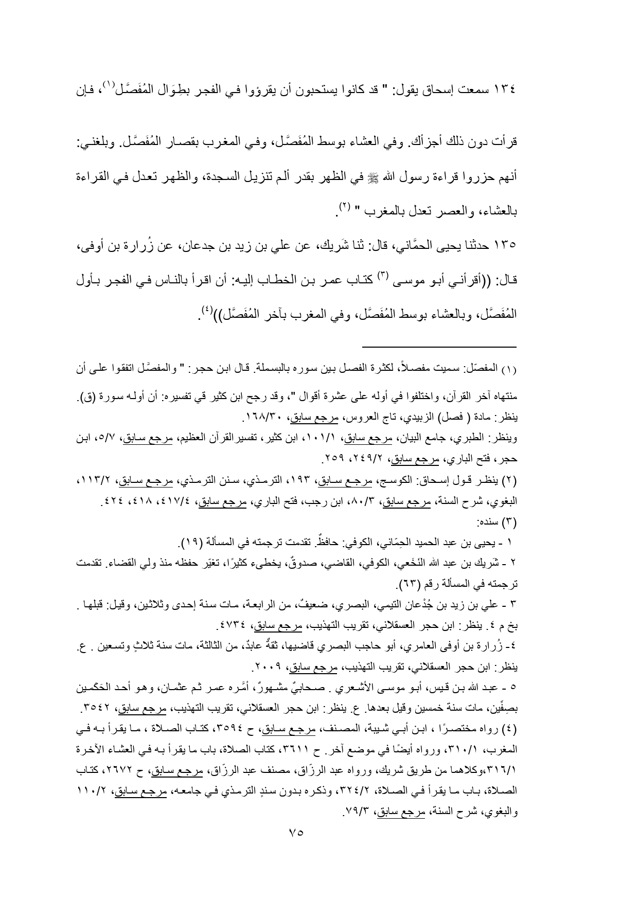 134 - سمعت إسحاق يقول: " قد كانوا يستحبون أن يقرؤوا في الفجر بطِوَال المُفَصَّل (¬1)، فإن قرأت دون ذلك أجزأك. وفي العشاء بوسط المُفَصَّل، وفي المغرب بقصار المُفَصَّل. وبلغني: أنهم حزروا قراءة رسول الله - صلى الله عليه وسلم - في الظهر بقدر ألم تنزيل السجدة، والظهر تعدل في القراءة بالعشاء، والعصر تعدل بالمغرب " (¬2).
