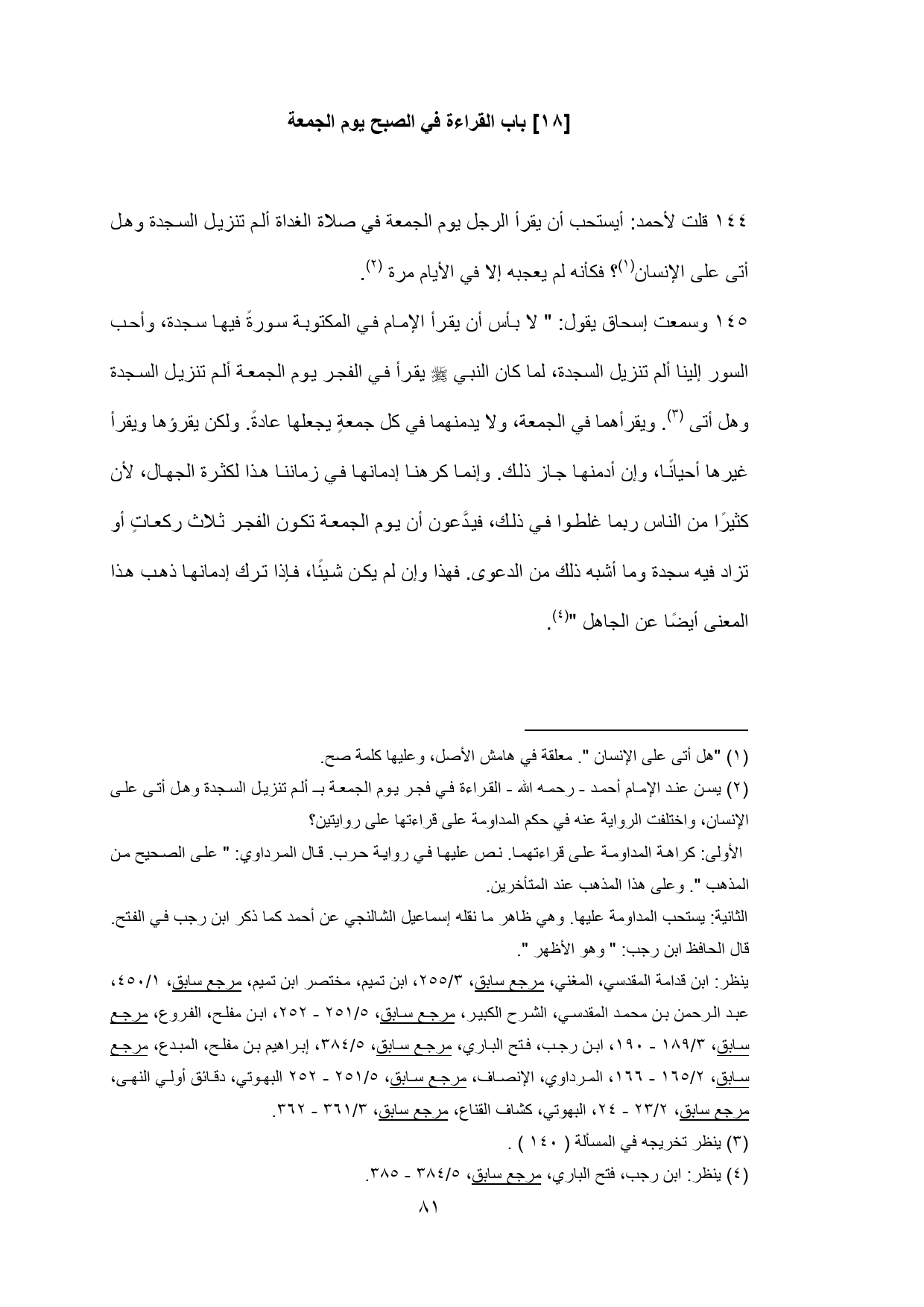 144 - قلت لأحمد: أيستحب أن يقرأ الرجل يوم الجمعة في صلاة الغداة ألم تنزيل السجدة وهل أتى على الإنسان (¬1)؟ فكأنه لم يعجبه إلا في الأيام مرة (¬2).