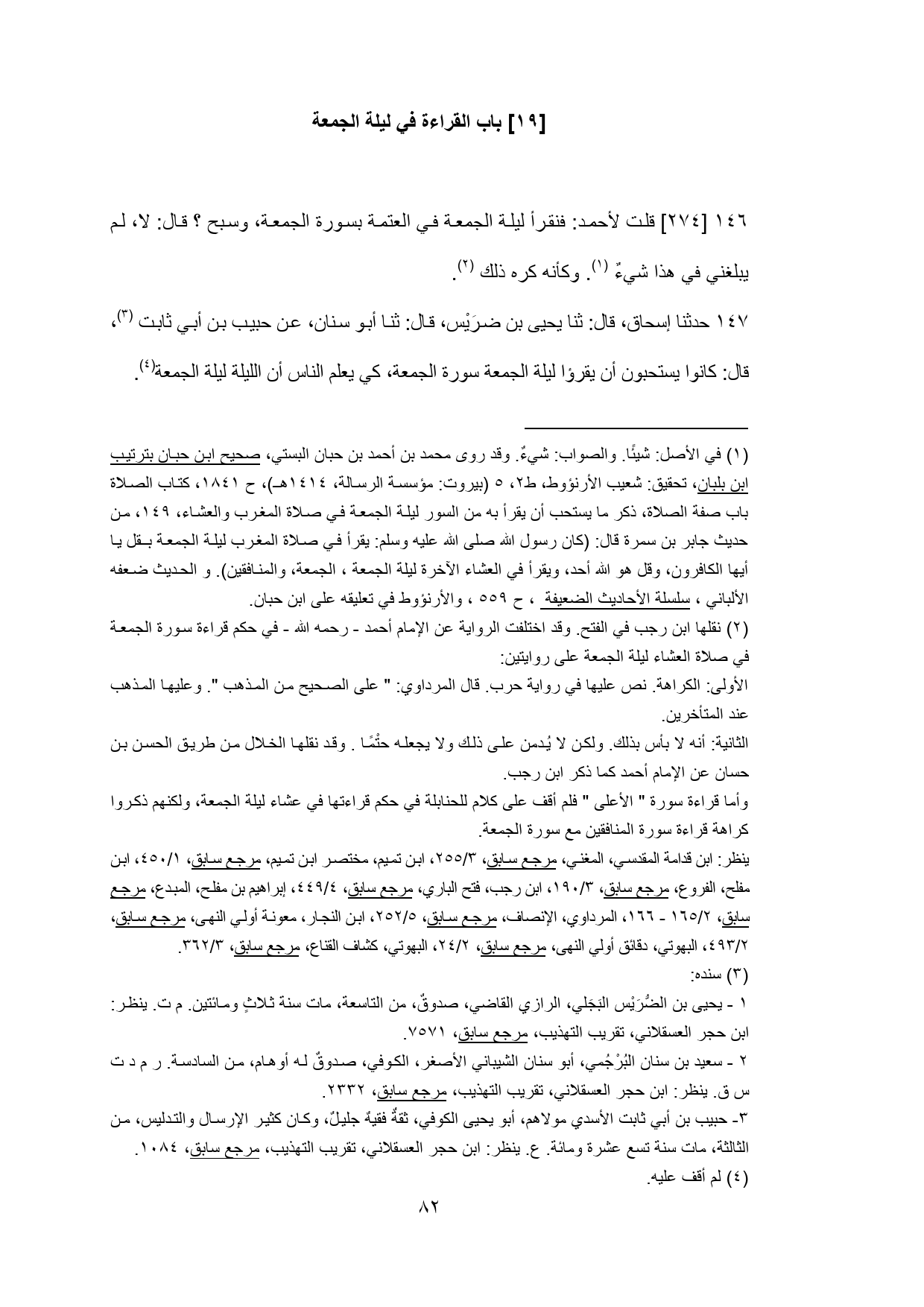 (¬1) في الأصل: شيئًا. والصواب: شيءٌ. وقد روى محمد بن أحمد بن حبان البستي، صحيح ابن حبان بترتيب ابن بلبان، تحقيق: شعيب الأرنؤوط، ط 2، 5 (بيروت: مؤسسة الرسالة، 1414 هـ)، ح 1841، كتاب الصلاة باب صفة الصلاة، ذكر ما يستحب أن يقرأ به من السور ليلة الجمعة في صلاة المغرب والعشاء، 149، من حديث جابر بن سمرة قال: (كان رسول الله صلى الله عليه وسلم: يقرأ في صلاة المغرب ليلة الجمعة بقل يا أيها الكافرون، وقل هو الله أحد، ويقرأ في العشاء الآخرة ليلة الجمعة , الجمعة، والمنافقين). والحديث ضعفه الألباني، سلسلة الأحاديث الضعيفة , ح 559 , والأرنؤوط في تعليقه على ابن حبان.