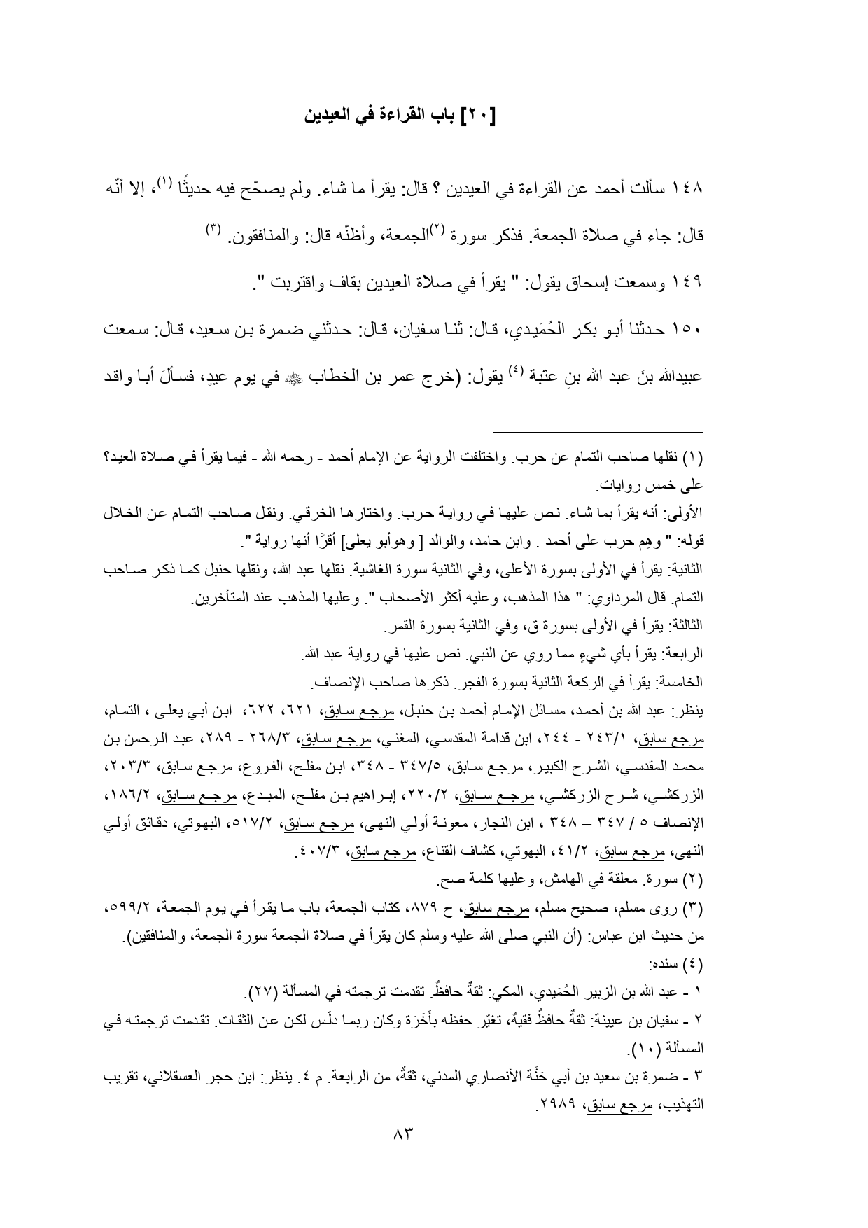 (¬1) نقلها صاحب التمام عن حرب. واختلفت الرواية عن الإمام أحمد - رحمه الله - فيما يقرأ في صلاة العيد؟ على خمس روايات.