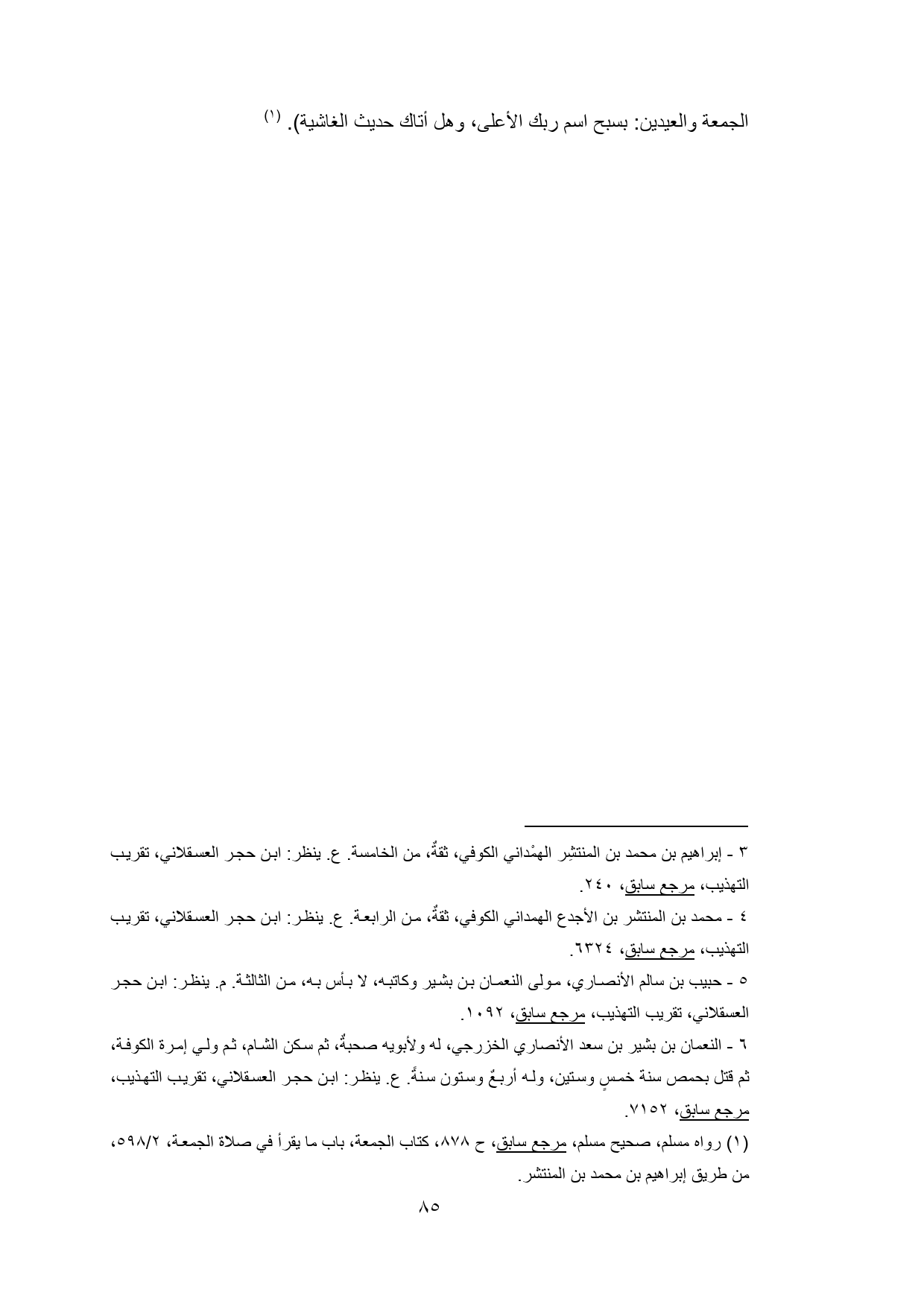 (¬1) رواه مسلم، صحيح مسلم، مرجع سابق، ح 878، كتاب الجمعة، باب ما يقرأ في صلاة الجمعة، 2/ 598, من طريق إبراهيم بن محمد بن المنتشر.