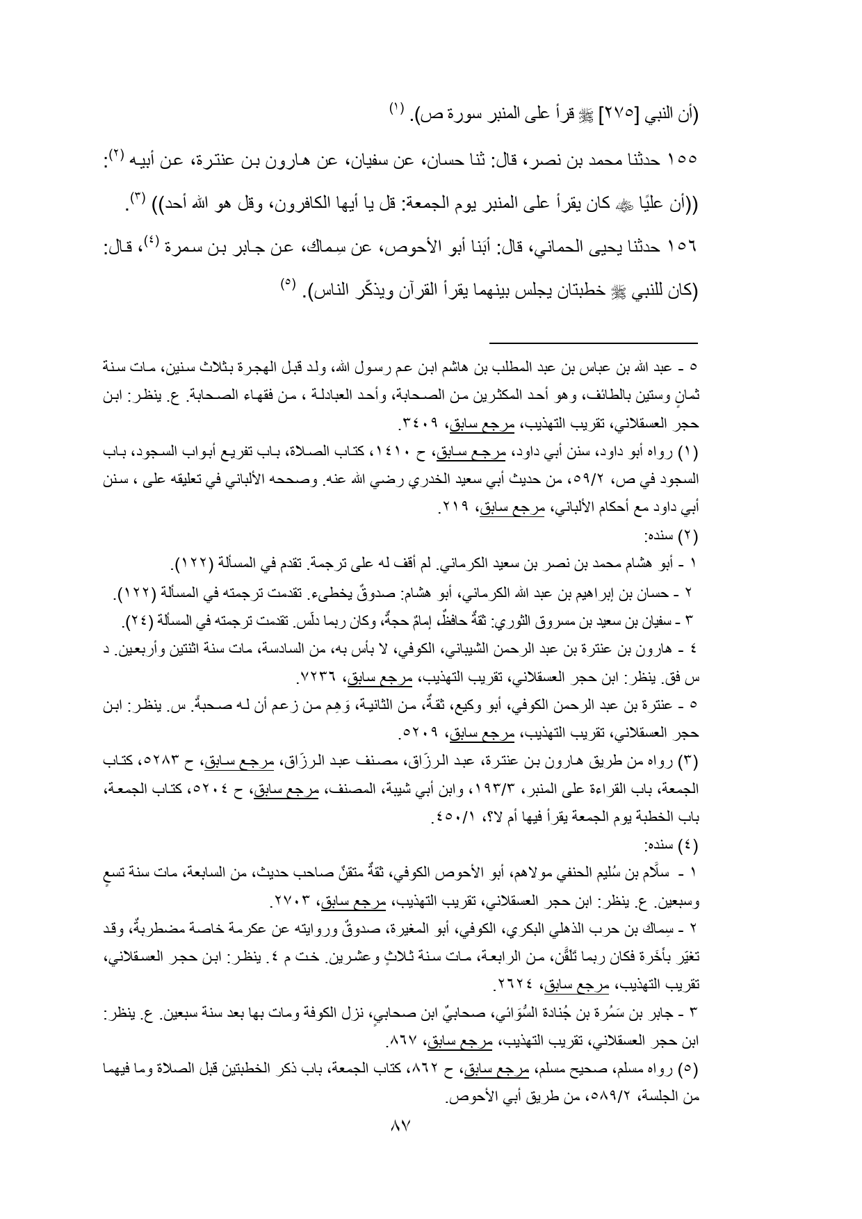 3 - جابر بن سَمُرة بن جُنادة السُّوَائي، صحابيٌ ابن صحابيٍ، نزل الكوفة ومات بها بعد سنة سبعين. ع. ينظر: ابن حجر العسقلاني، تقريب التهذيب، مرجع سابق، 867.