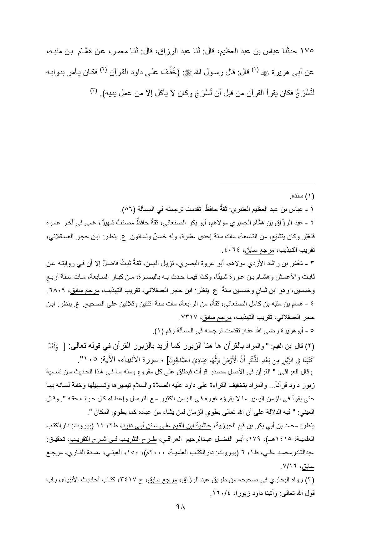 175 - حدثنا عباس بن عبد العظيم، قال: ثنا عبد الرزاق، قال: ثنا معمر، عن هَمَّام بن منبه، عن أبي هريرة - رضي الله عنه - (¬1) قال: قال رسول الله - صلى الله عليه وسلم -: (خُفِّفَ على داود القرآن (¬2) فكان يأمر بدوابه لتُسْرَجُ فكان يقرأ القرآن من قبل أن تُسْرَجَ وكان لا يأكل إلا من عمل يديه). (¬3)