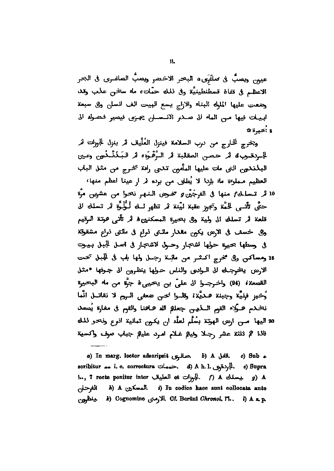 عيون ويصبّ فى صاغرى البحر الاخضر ويصبّ الصاغرى فى الجر الاعظم فى قفا قسطنطينيّة وفى ذلك حمّات ماء سخن عذب وقد وضعت عليها الملوك البناء والازاج يسع البيت الف انسان وهى سبعة ابيات فيها من الماء الى صدر الانسان يجرى فيصير فضوله الى بحيرة ويخرج الخارج من درب السلامة فينزل العلّيق ثم ينزل الجوزات ثم الجردقوب ثم حصن الصقالبة ثم الرّهوة ثم البذندون وعين البذندون التى مات عليها المأمون تدعى راقة تخرج من مثل الباب العظيم مملوءة ماء باردا لا يطاق من برده لم أر عينا اعظم منها، ثم تسلك منها فى الفرجين تخوض النهر نحوا من عشرين مرّة حتّى تأتى الحمّة وتجوز عقبة ليّنة ثم تظهر لك لؤلؤة ثم تسلك الى قلعة ثم تسلك الى ولية وهى بحيرة المسكنين ثم تأتى هوتة الرقيم وهى خسف فى الارض يكون مقدار مائتى ذراع فى مائتى ذراع مشقوقة فى وسطها بحيرة حولها اشجار وحول الاشجار فى اصل الجبل بيوت ومساكن وهى مخرج اكثر من مائة رجل ولها باب فى الجبل تحت الارض يخرجك الى الوادى والناس حولها ينظرون الى جوفها مثل القصعة (94) واخرجوا الى علىّ بن يحيى جرّة من ماء البحيرة وخبز فرنيّة وجبنة هديّة وقالوا نحن ضعفى الروم لا نقاتل انّما نخدم هؤلاء القوم الذين جعلهم الله هاهنا والقوم فى مغارة يصعد اليها من ارض الهوتة بسلّم لعلّه ان يكون ثمانية اذرع ونحو ذلك فاذا هم ثلثة عشر رجلا وفيهم غلام امرد عليهم جباب صوف واكسية